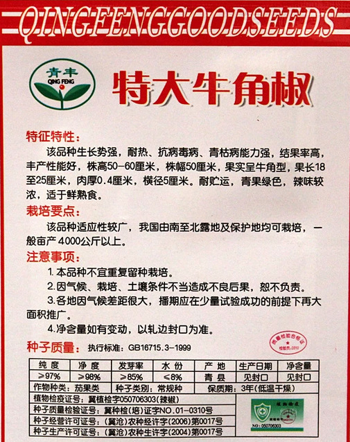 商品名稱:蔬菜種子 青豐 特大牛角椒種子 特大辣椒種子 牛角型 5克袋裝