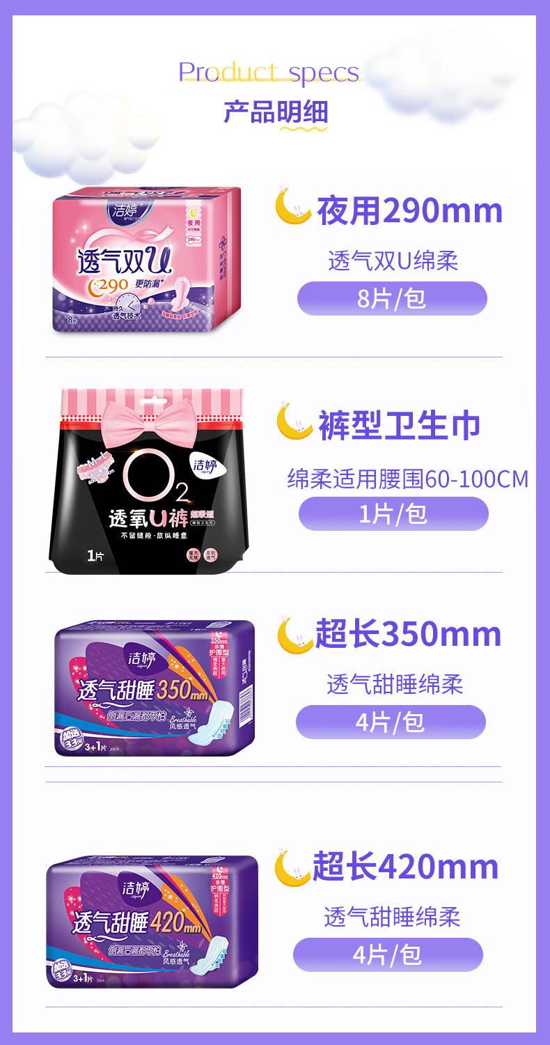 商品名稱:趙麗穎推薦潔婷衛(wèi)生巾純棉透氣防漏超長加長夜用姨媽巾多組合批發(fā)