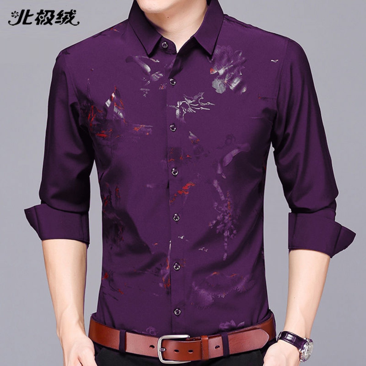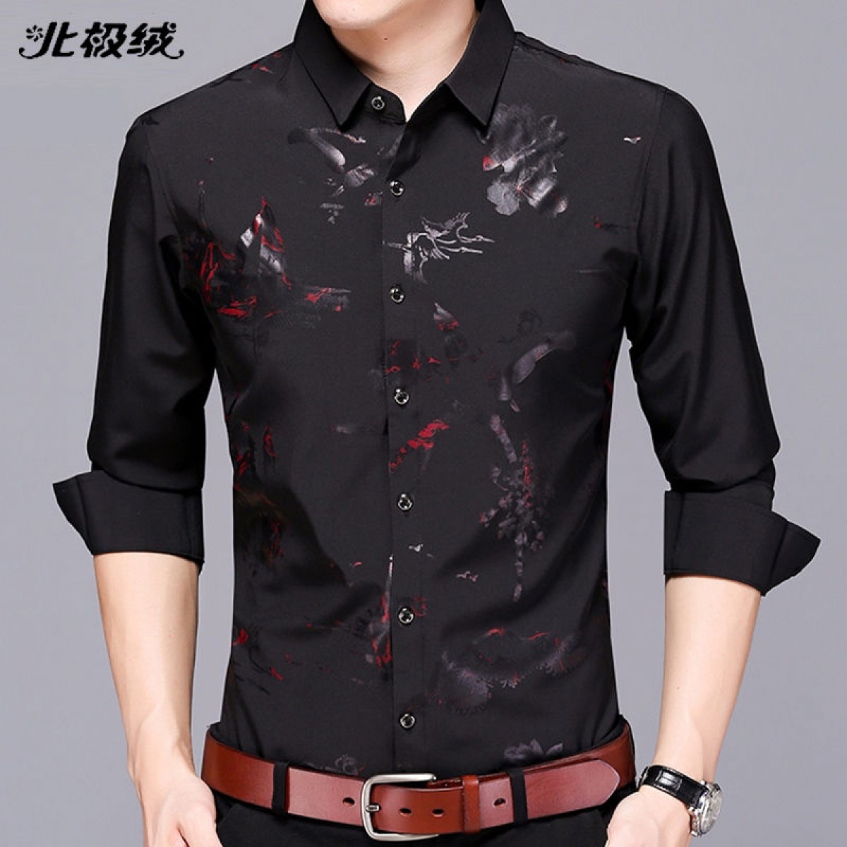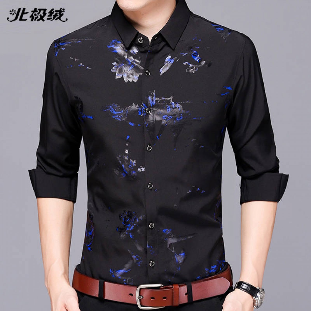 北極絨春秋新款翻領(lǐng)襯衫長(zhǎng)袖免燙加厚襯衣男士印花商務(wù)休閑