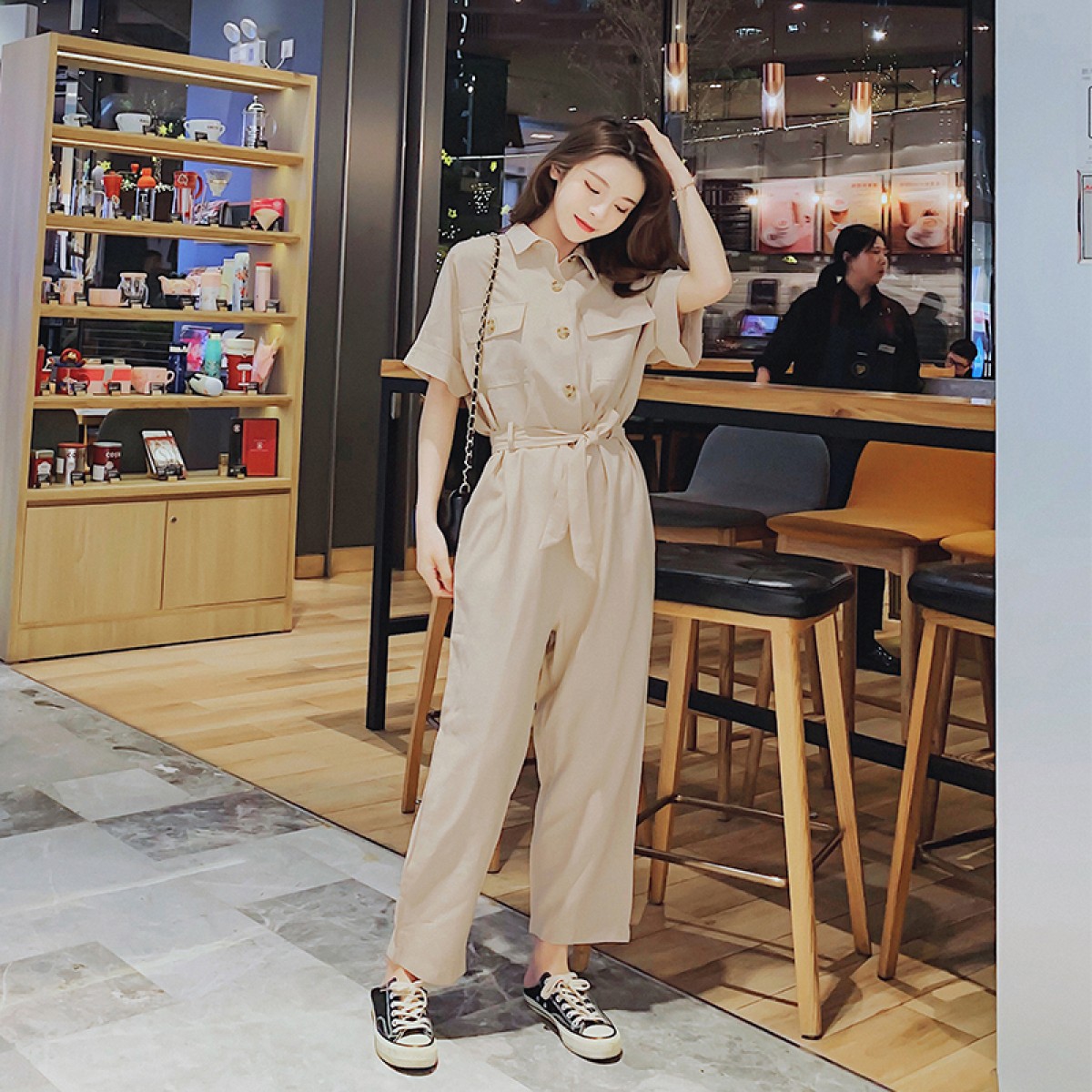 女新款時(shí)尚連體褲休閑高腰顯瘦工裝連衣褲九分闊腿褲套裝