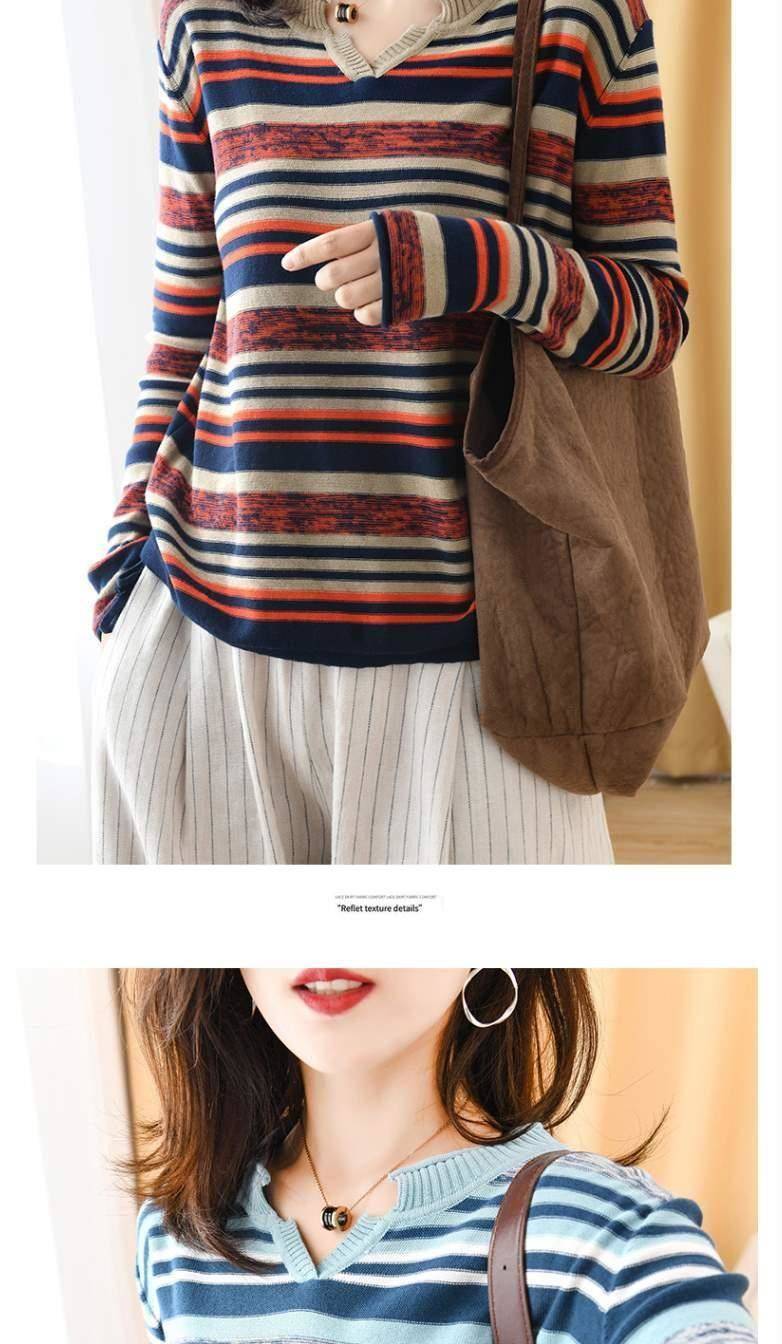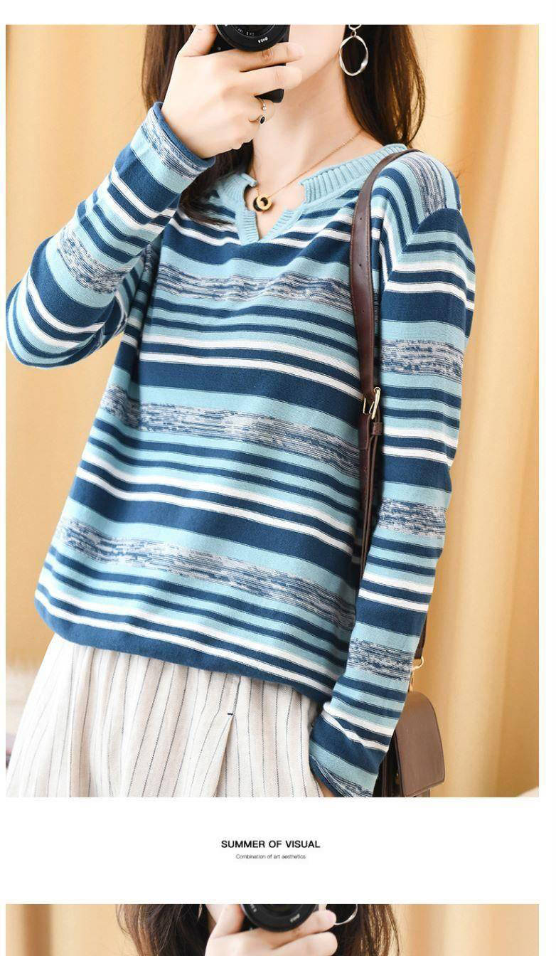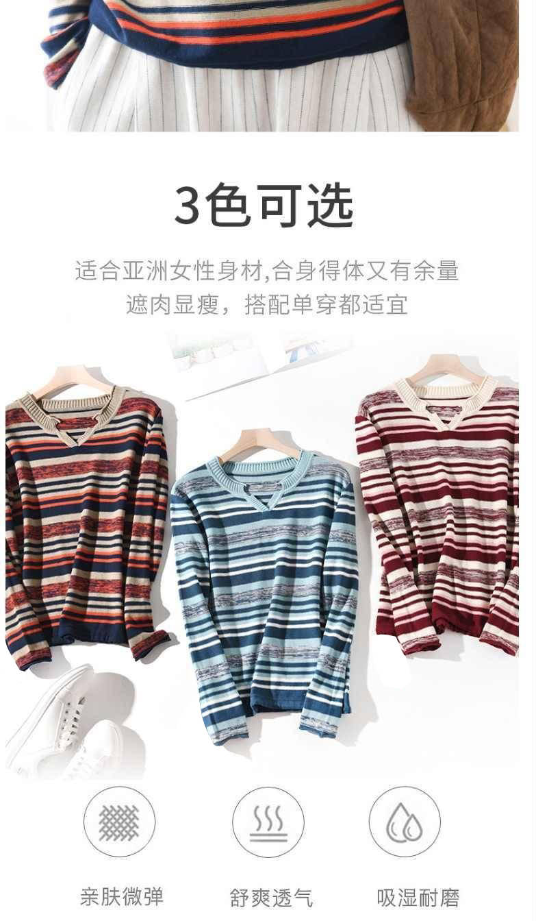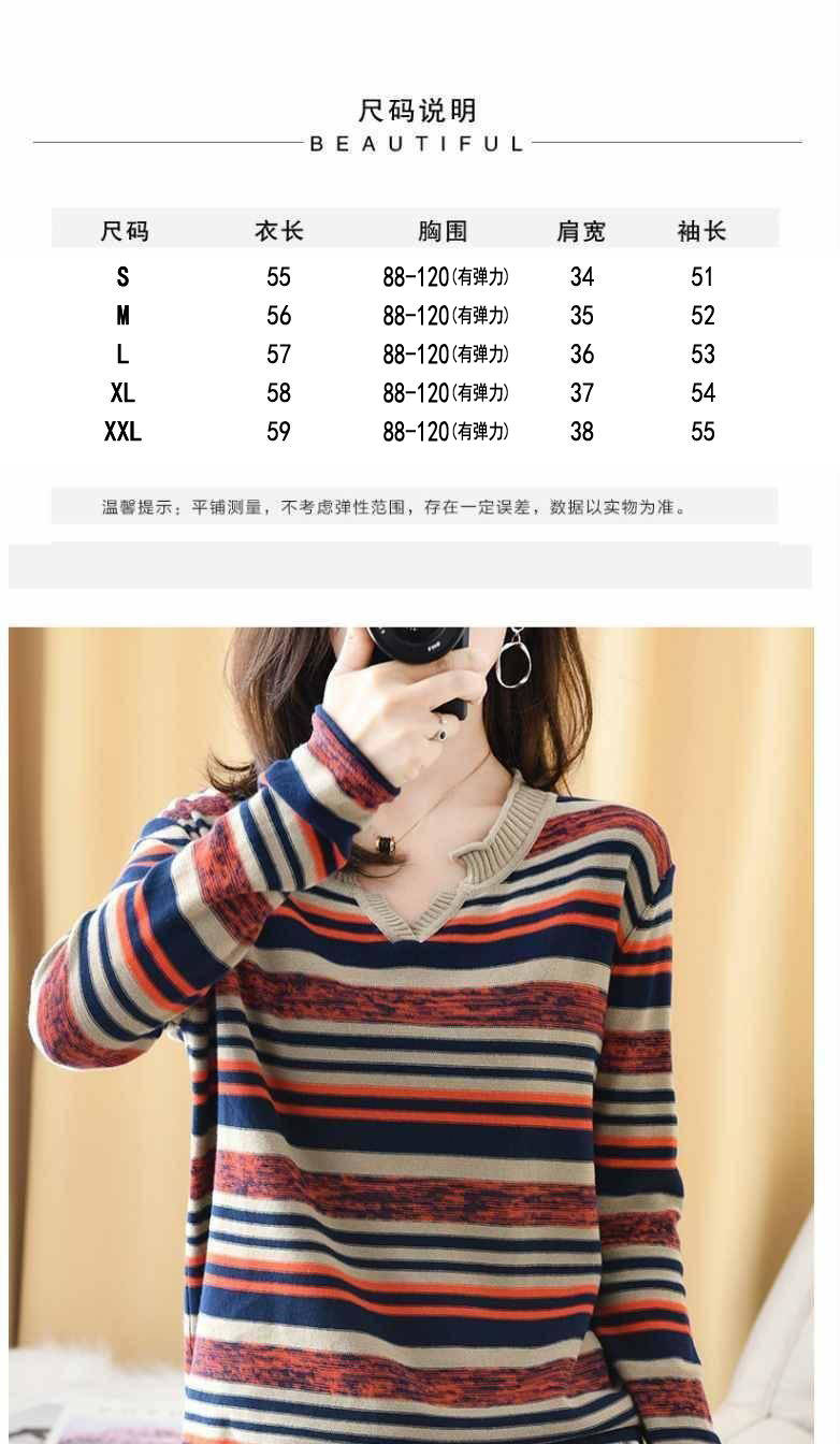 商品名稱:新款2019秋v領針織長袖女裝寬松毛衣上衣條紋針織衫薄款打底衫