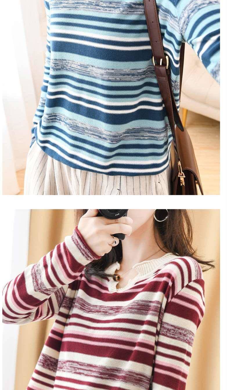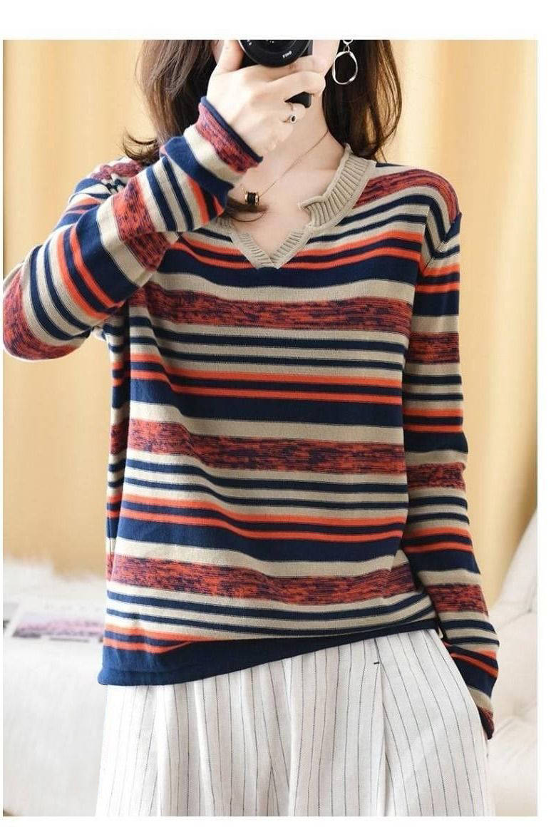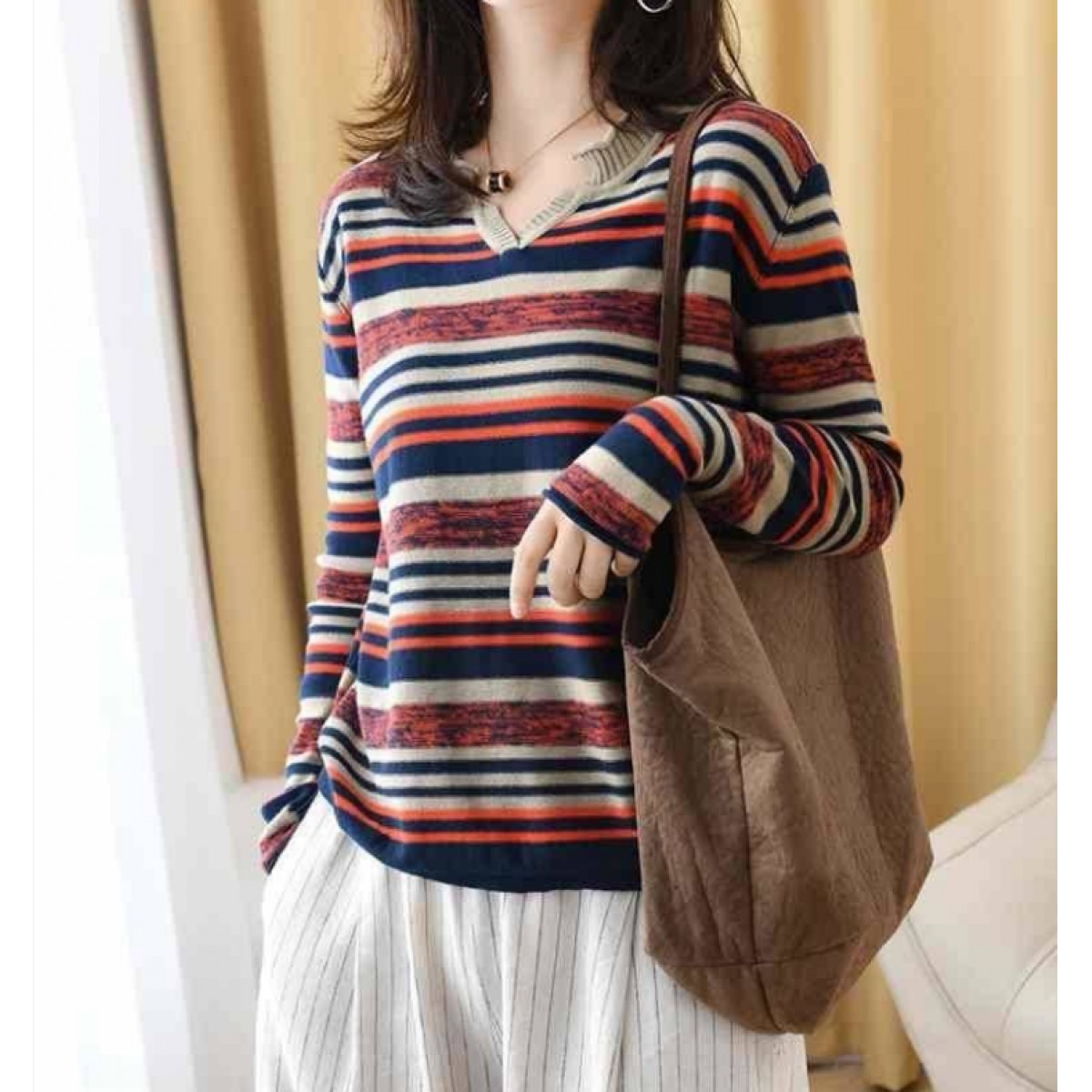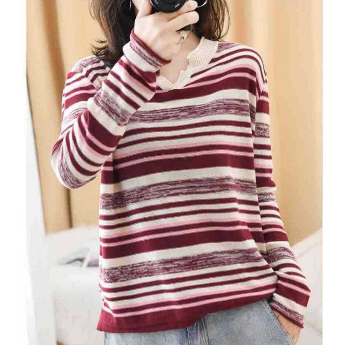 商品名稱:新款2019秋v領針織長袖女裝寬松毛衣上衣條紋針織衫薄款打底衫