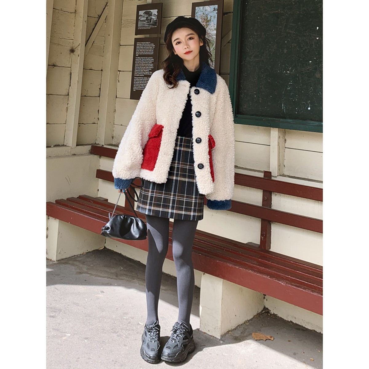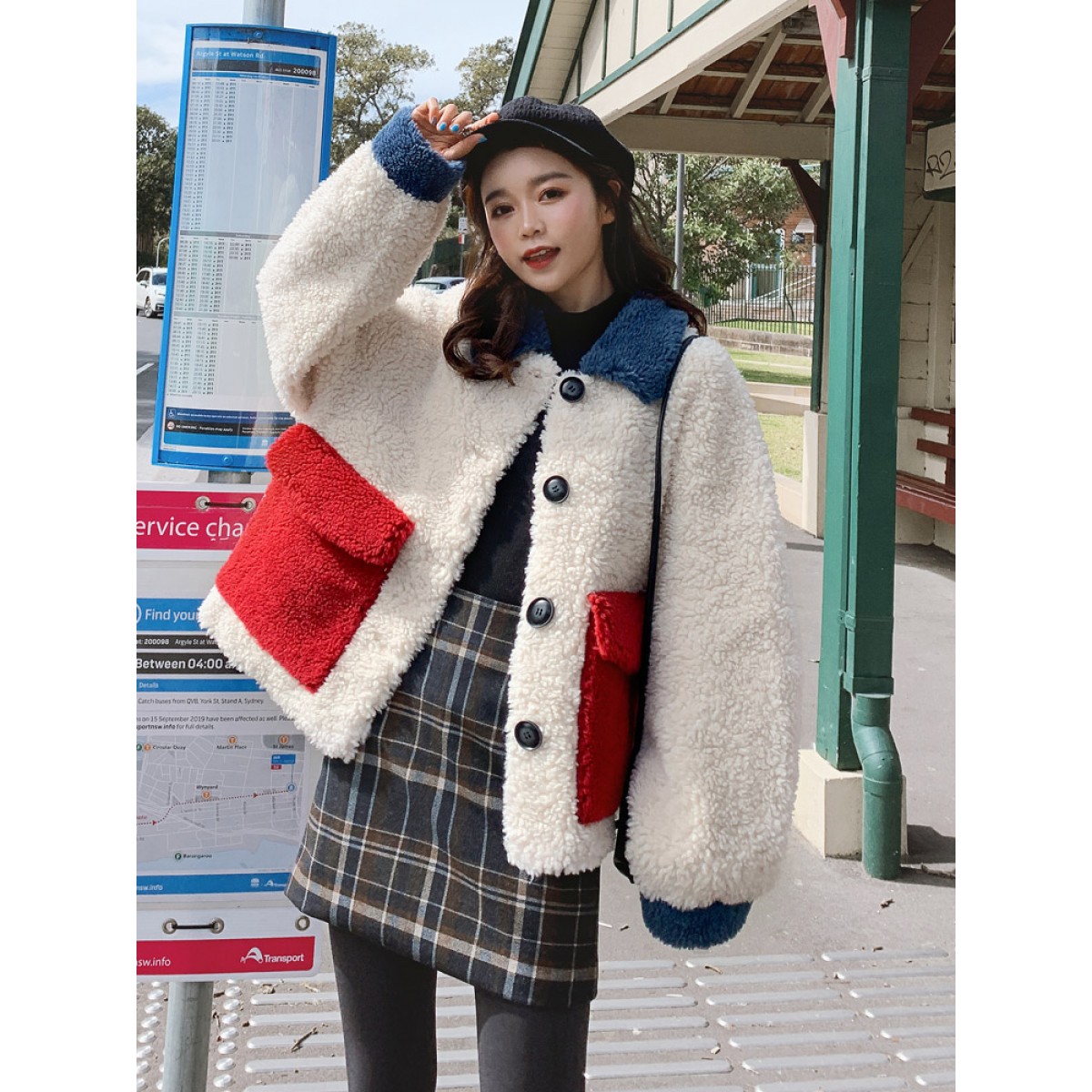 新款撞色拼接羊羔毛外套女港風(fēng)學(xué)生流行仿皮毛一體上衣潮
