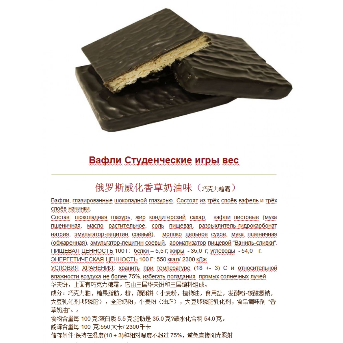 Вафли, глазированные шоколадной глазурью. Состоят из трёх слоёв вафель и трёх слоёв начинки.