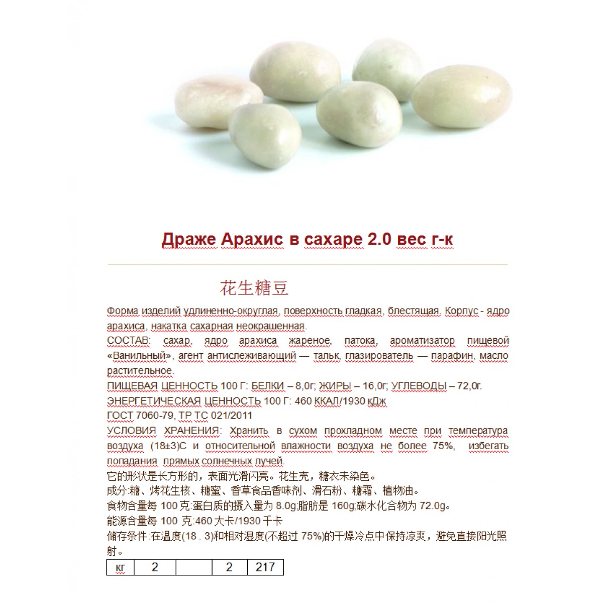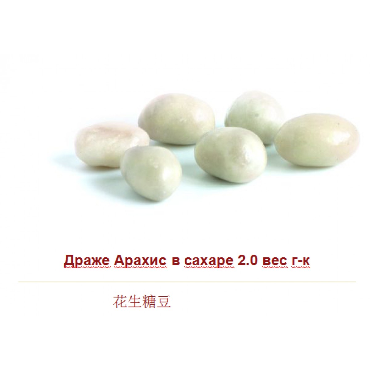 Форма изделий удлиненно-округлая, поверхность гладкая, блестящая. Корпус - ядро арахиса, накатка сахарная неокрашенная.