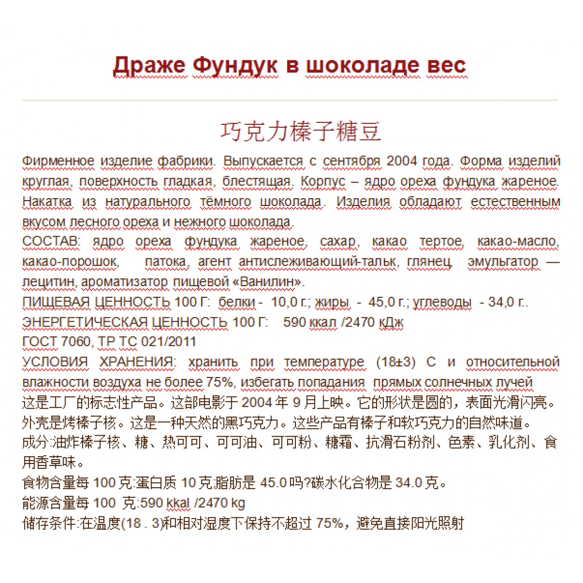 СОСТАВ: ядро ореха фундука жареное, сахар, какао тертое, какао-масло, какао-порошок, патока, агент антислеживающий-тальк, глянец, эмульгатор — лецитин, ароматизатор пищевой ?Ванилин?.