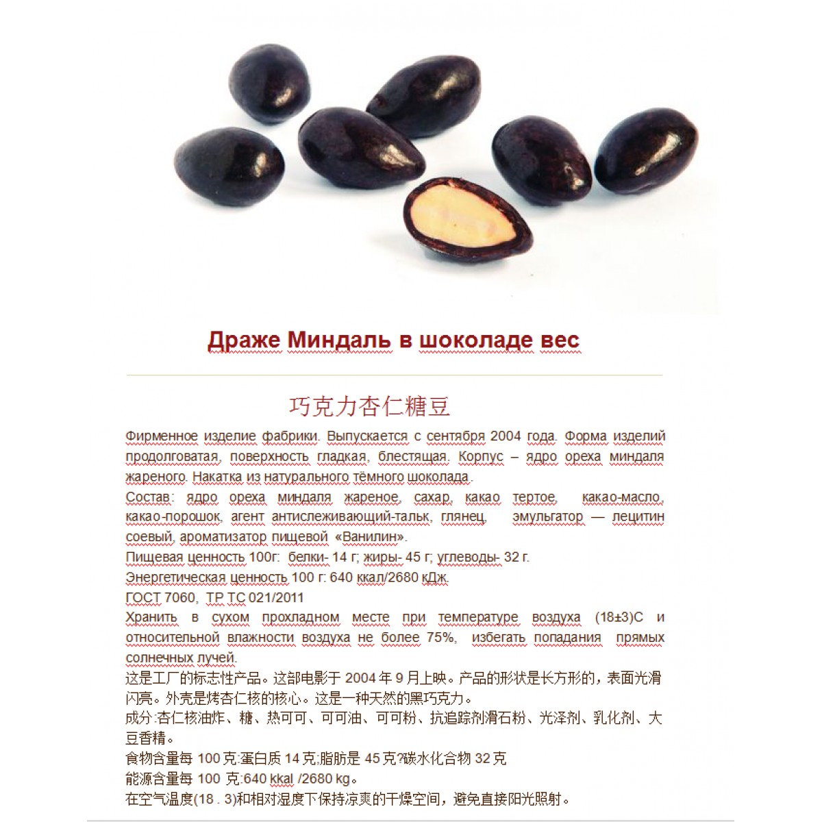 Состав: ядро ореха миндаля жареное, сахар, какао тертое, какао-масло, какао-порошок, агент антислеживающий-тальк, глянец, эмульгатор — лецитин соевый, ароматизатор пищевой ?Ванилин?.