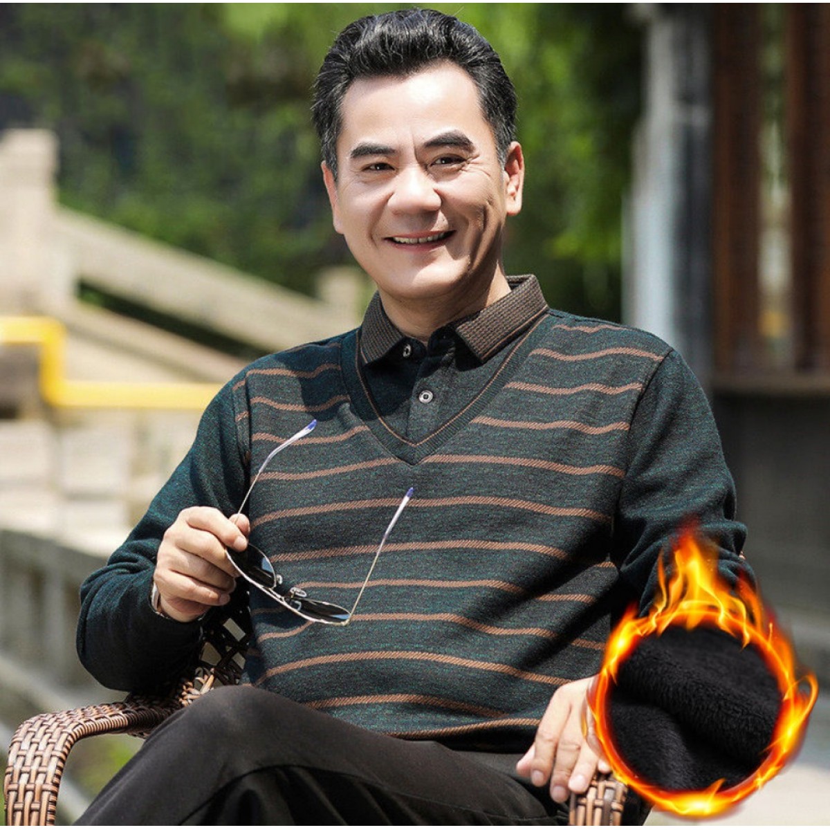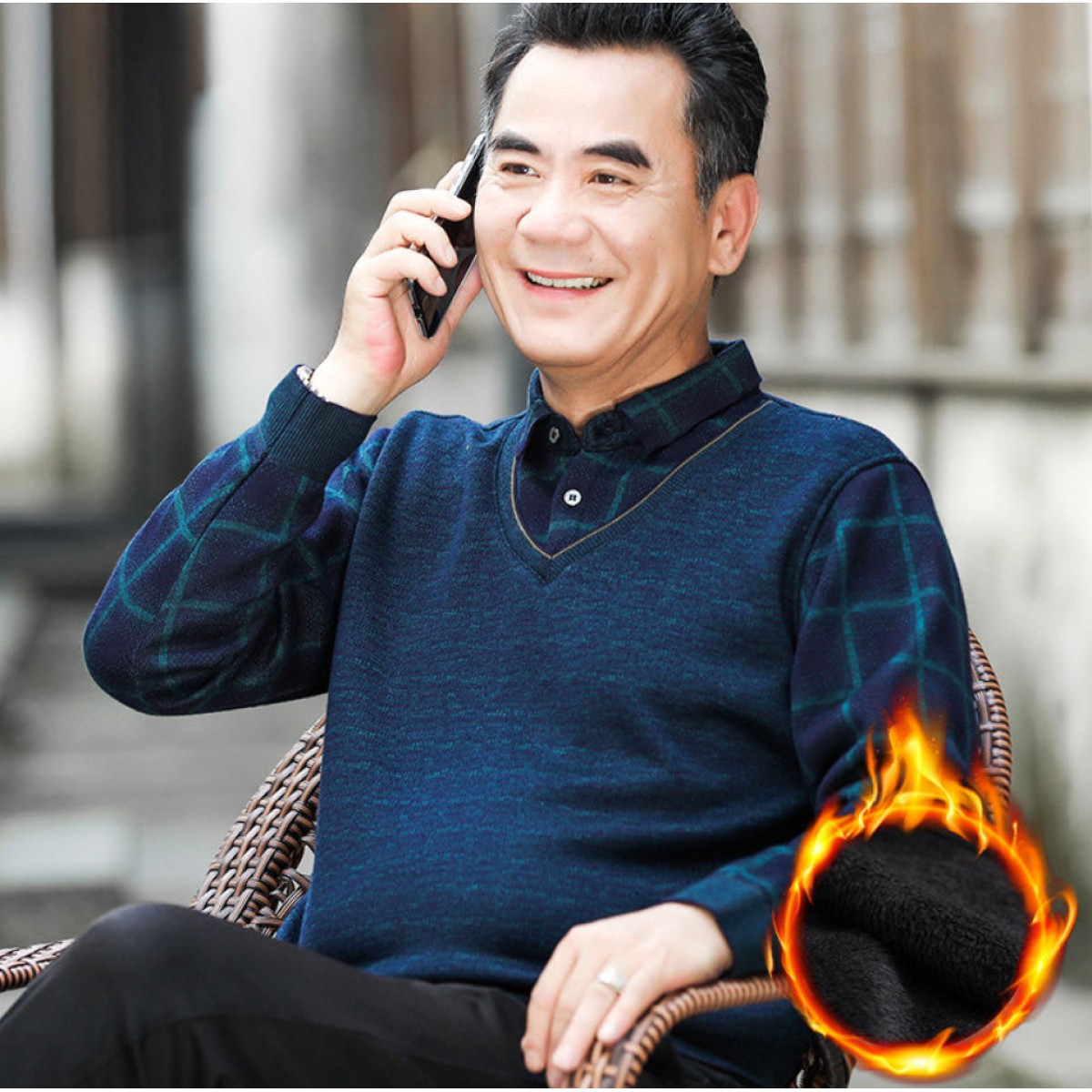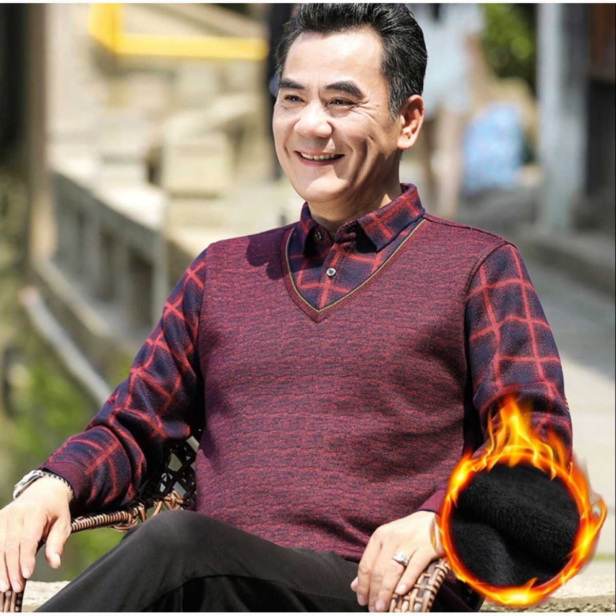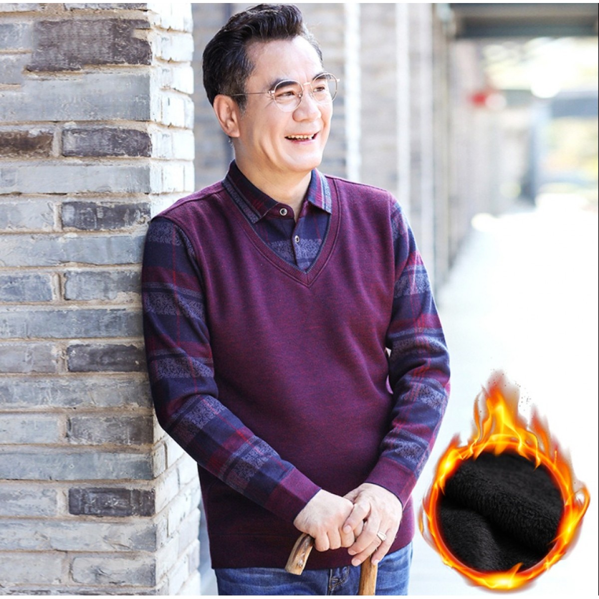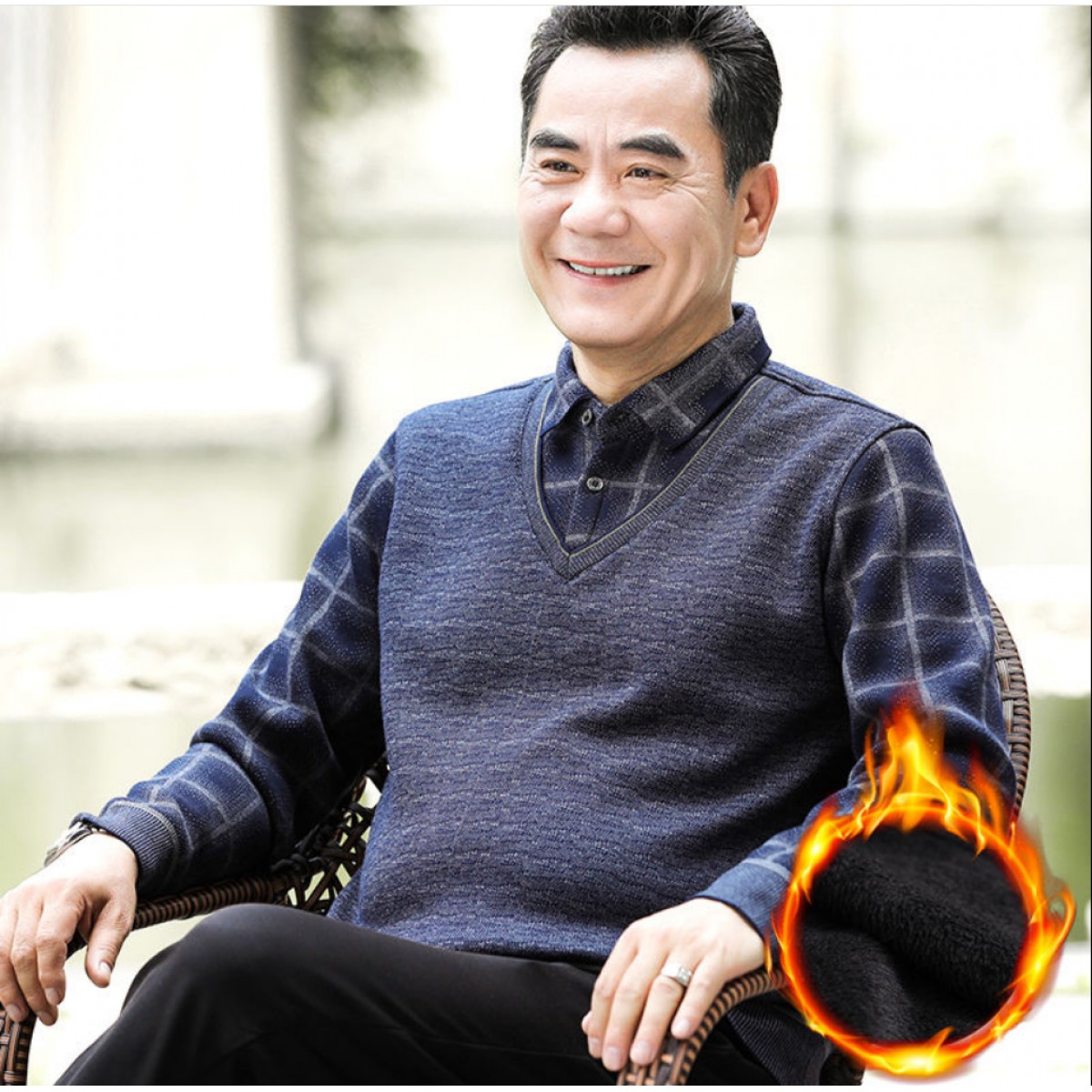 爸爸裝冬裝加絨加厚毛衣中年男士假兩件針織衫男裝保暖衣