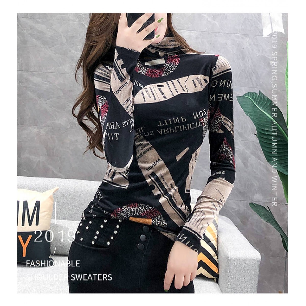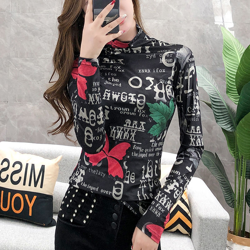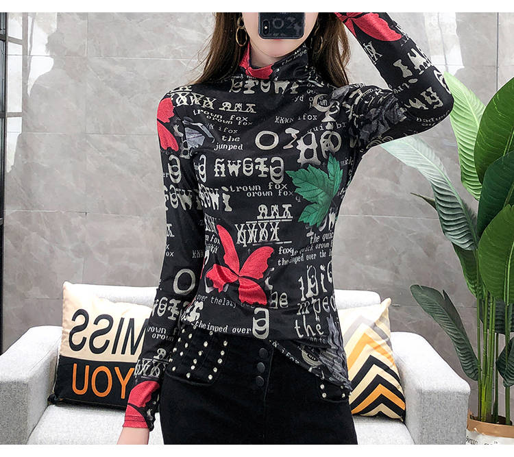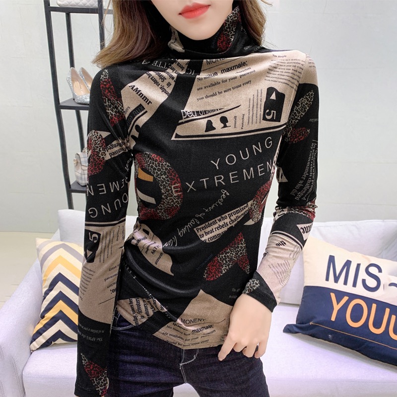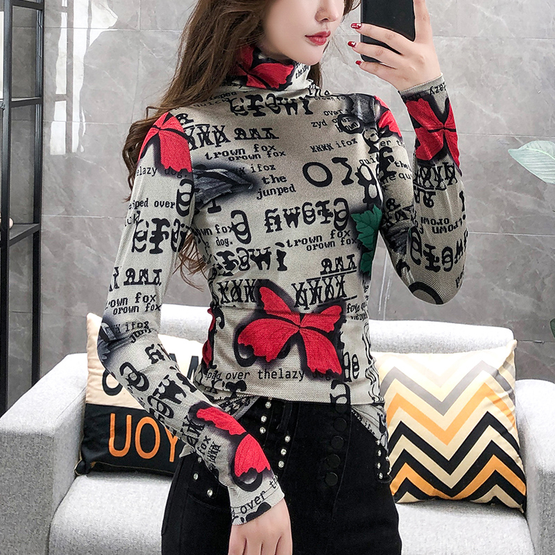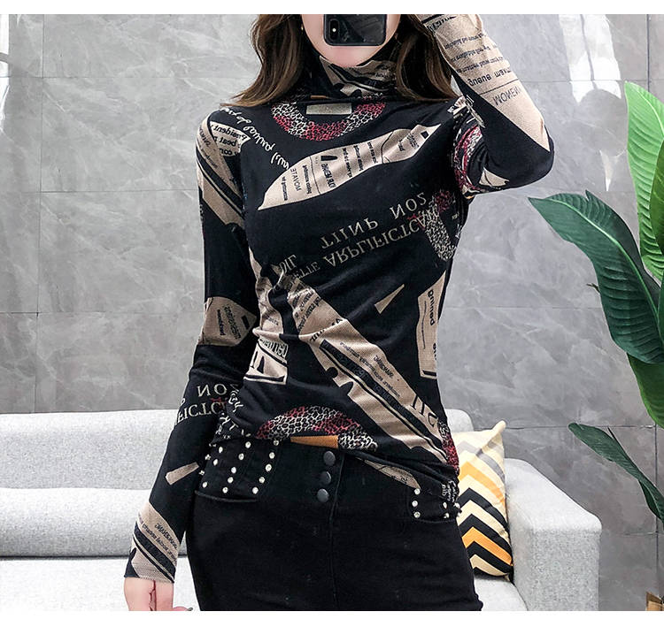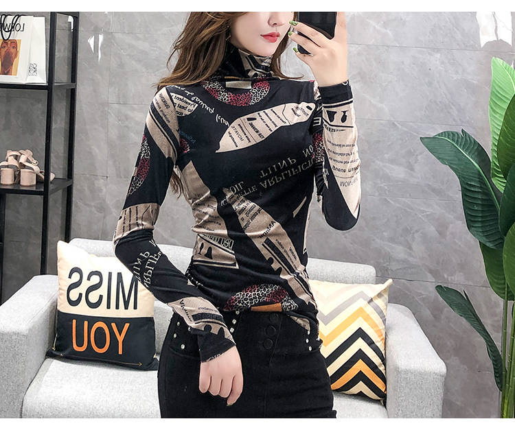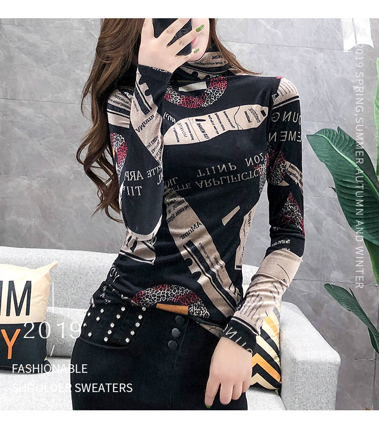 加絨保暖T恤打底衫女2019小衫女花色秋冬氣質(zhì)高領(lǐng)長袖時尚百搭潮