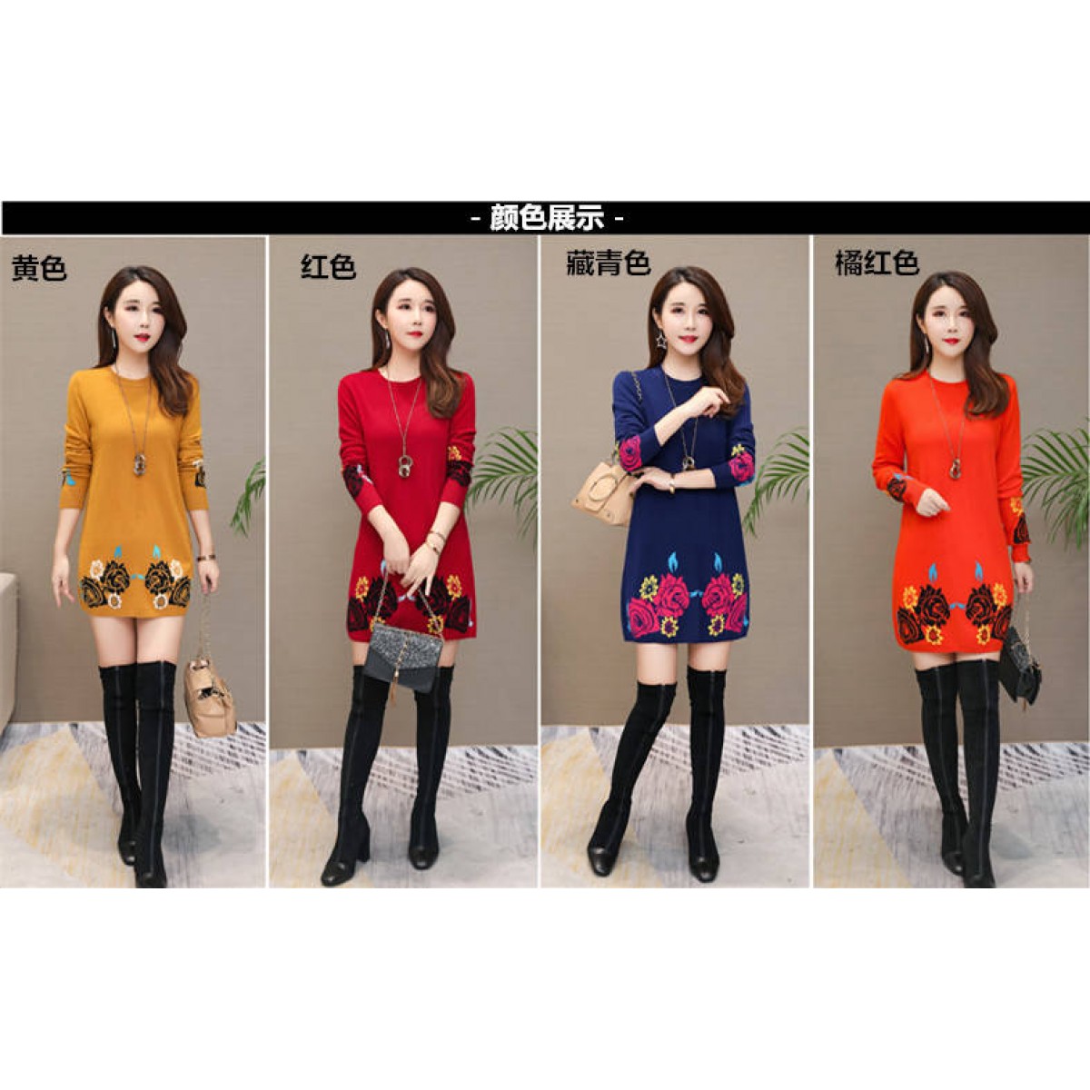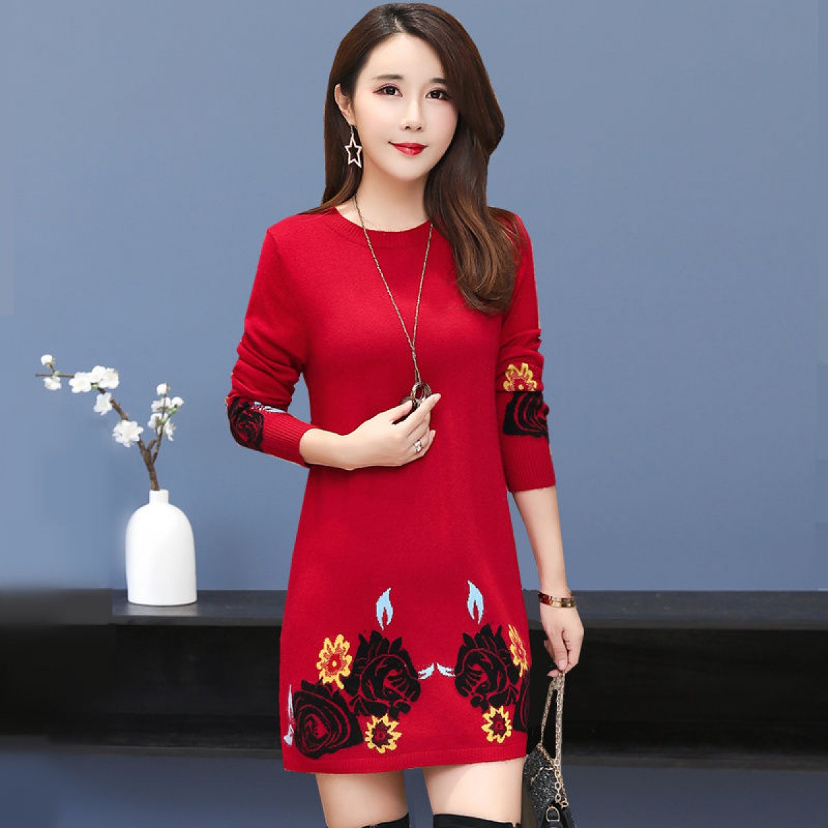 秋冬圓領(lǐng)媽媽寬松毛衣女中長(zhǎng)款印花連衣裙大碼中老年針織厚打底衫