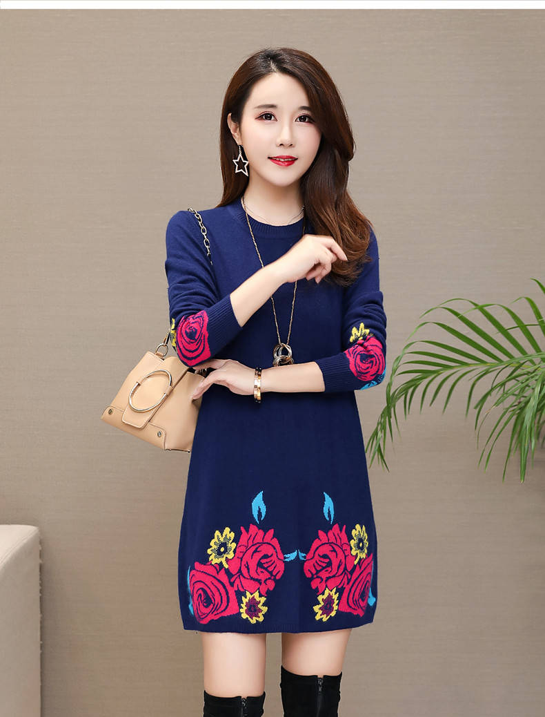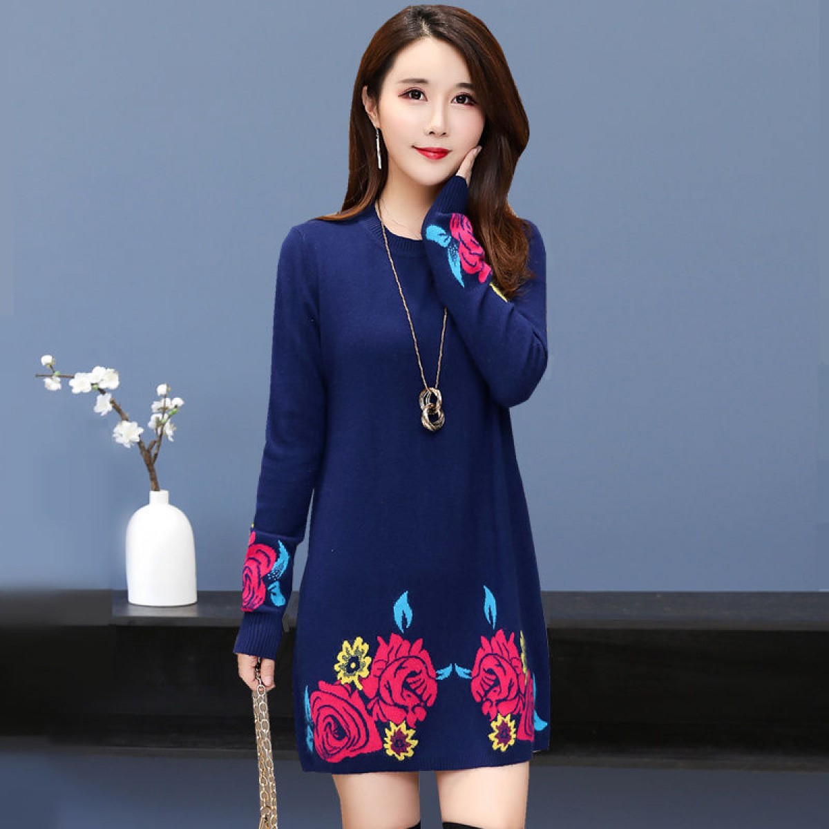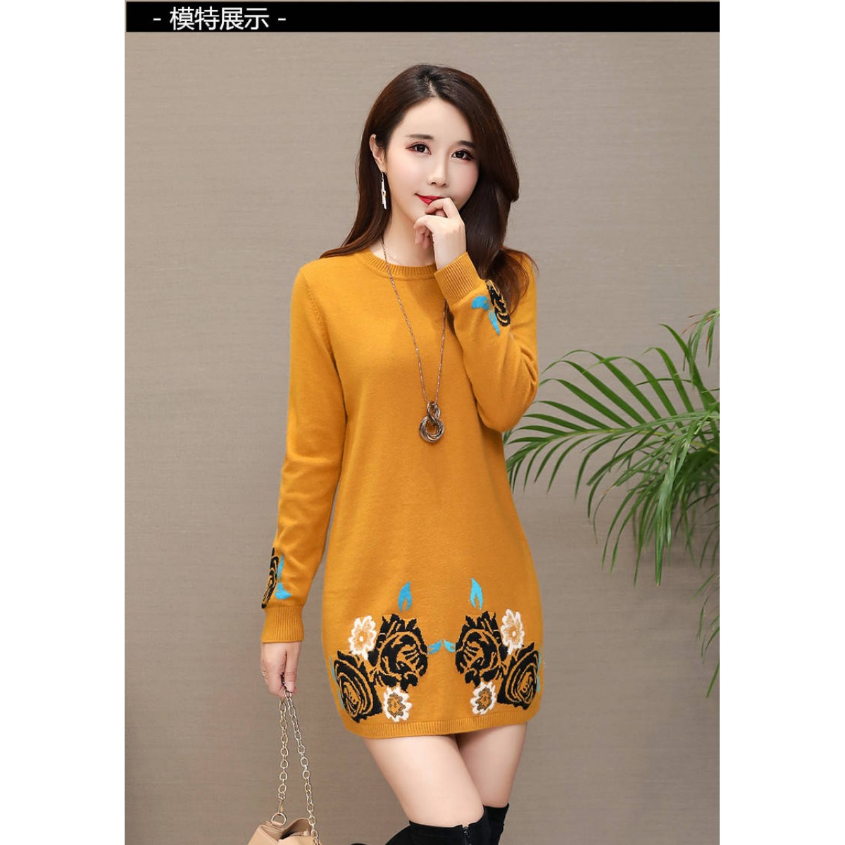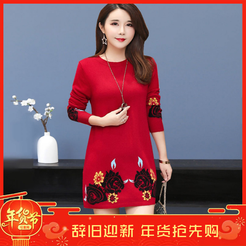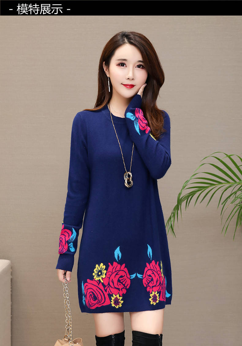 商品名稱:秋冬圓領(lǐng)媽媽寬松毛衣女中長(zhǎng)款印花連衣裙大碼中老年針織厚打底衫