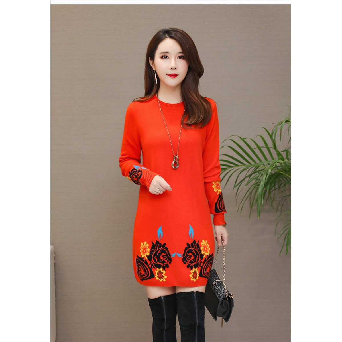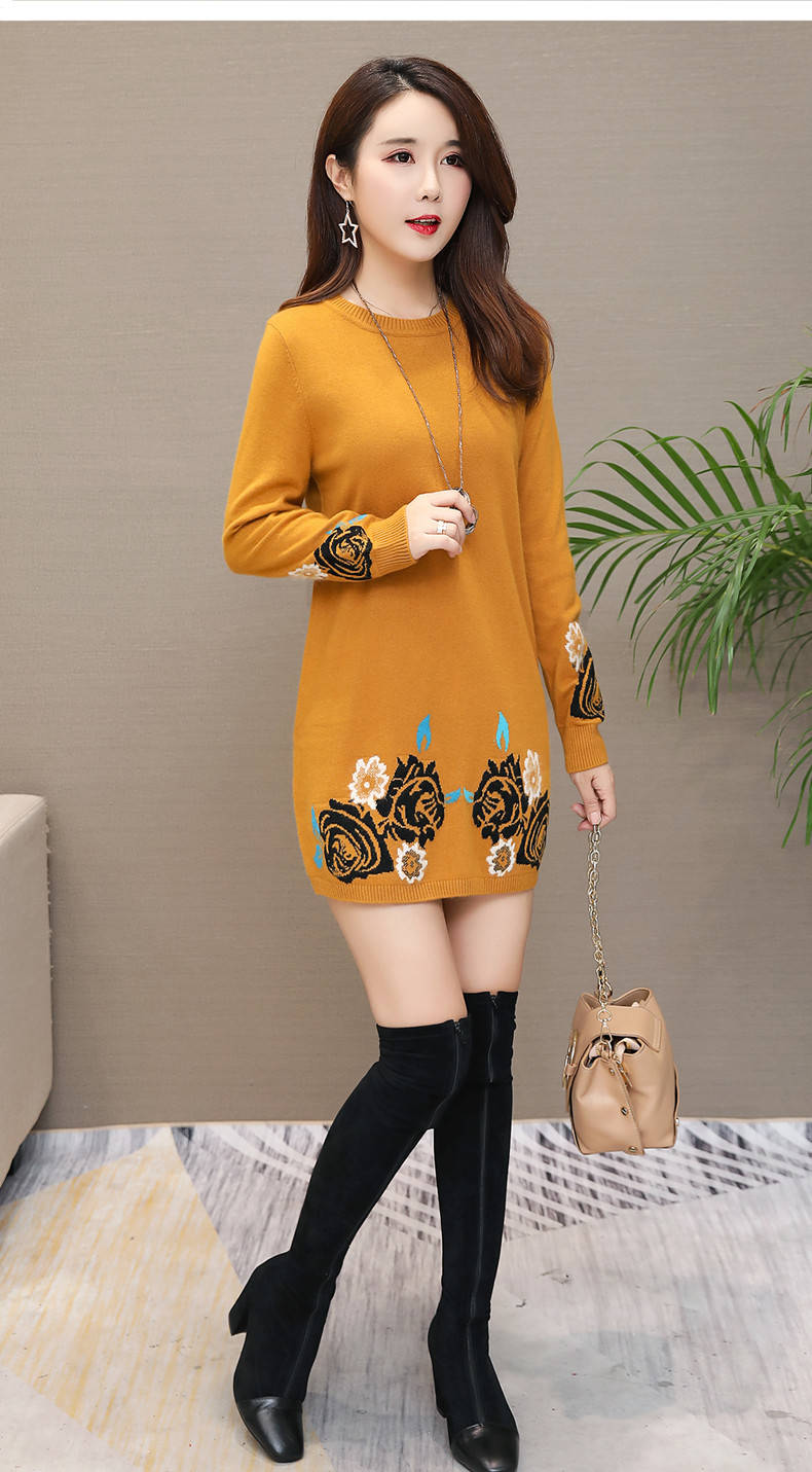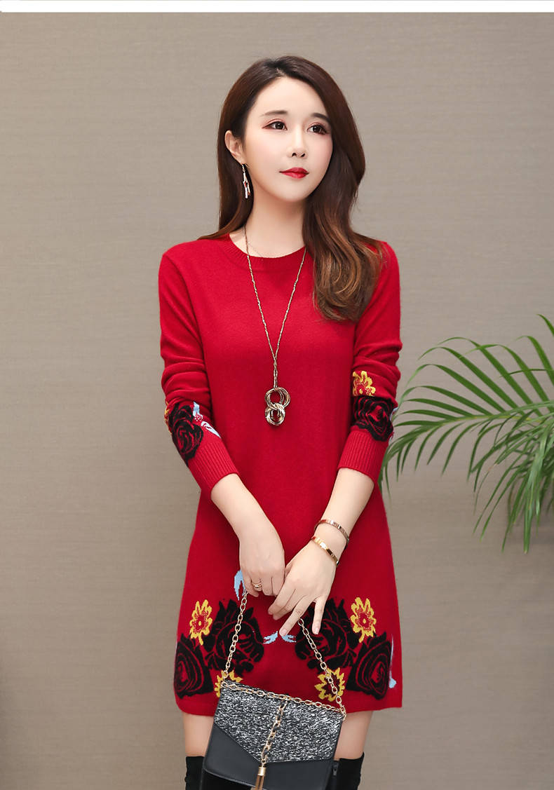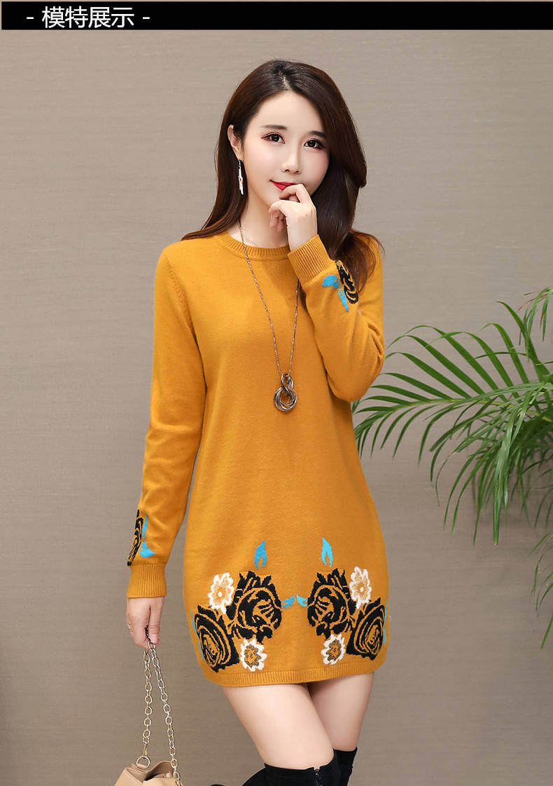 商品名稱:秋冬圓領(lǐng)媽媽寬松毛衣女中長(zhǎng)款印花連衣裙大碼中老年針織厚打底衫