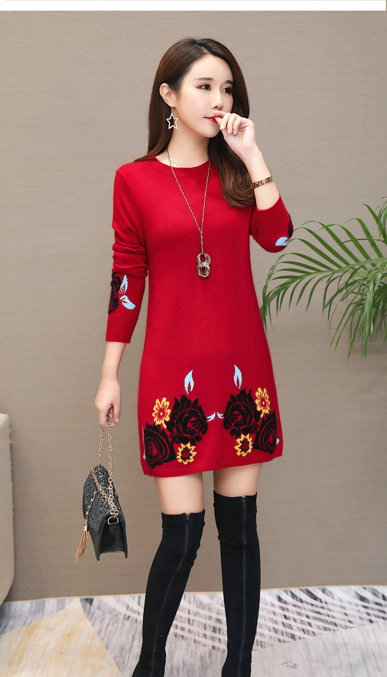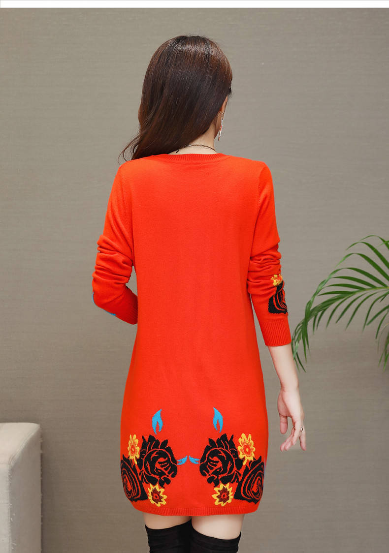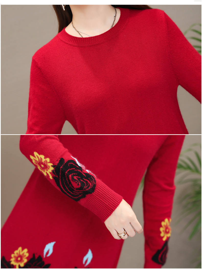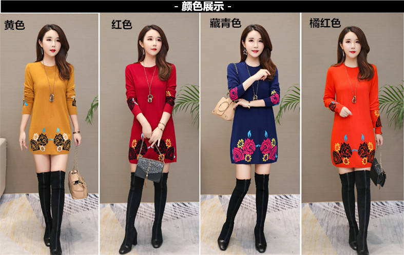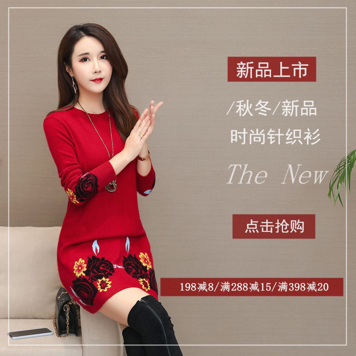 商品名稱:秋冬圓領(lǐng)媽媽寬松毛衣女中長(zhǎng)款印花連衣裙大碼中老年針織厚打底衫