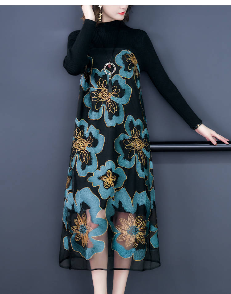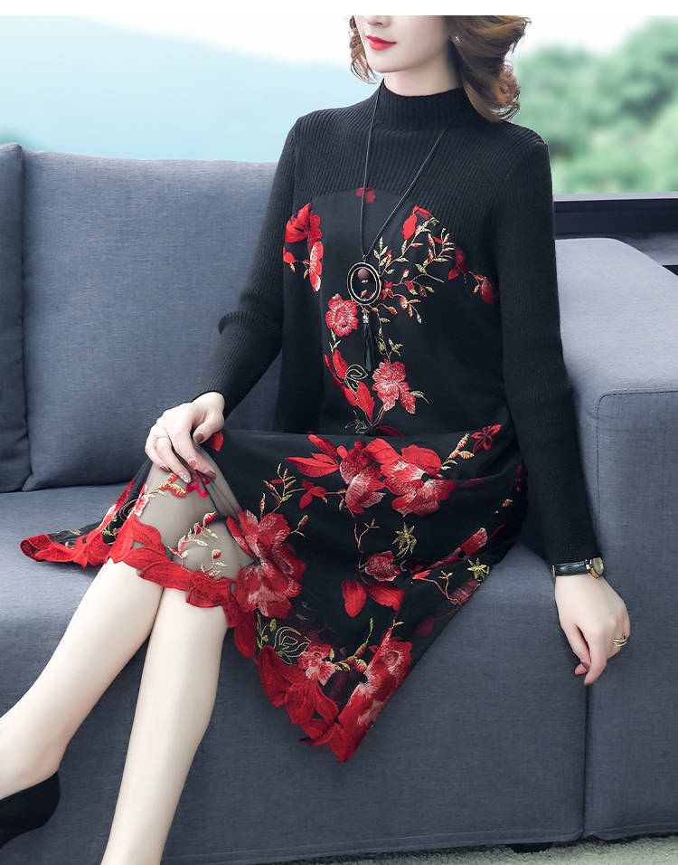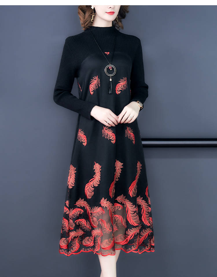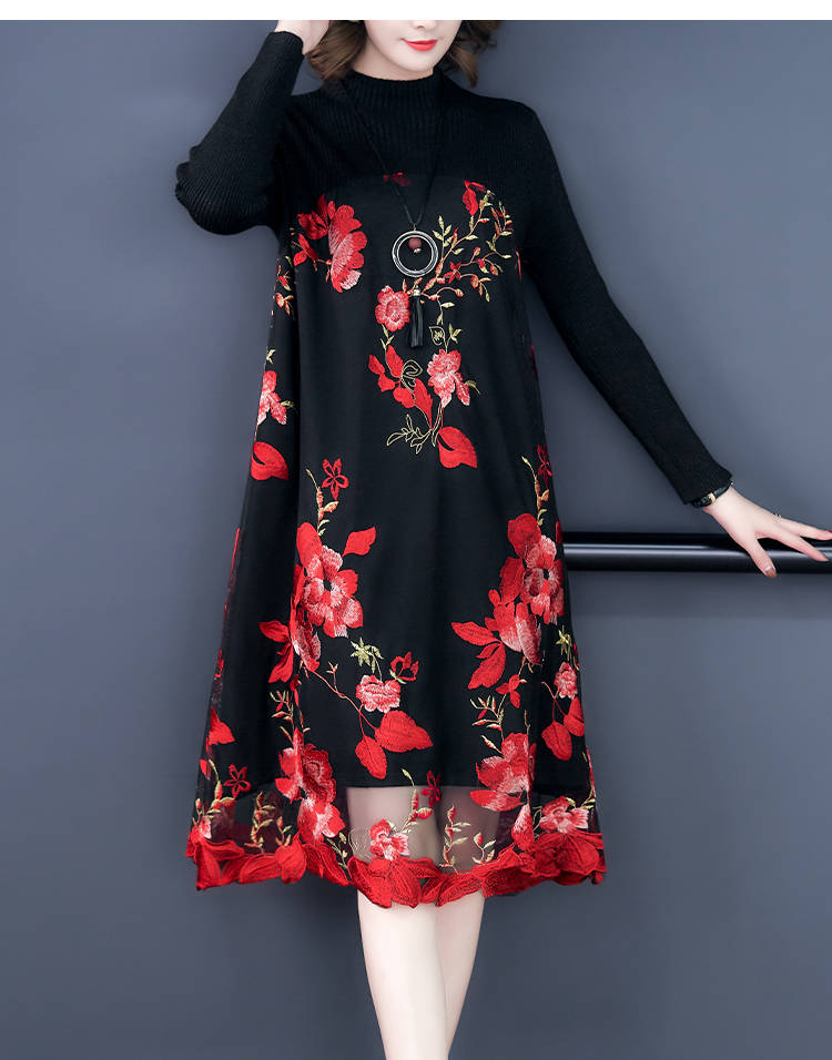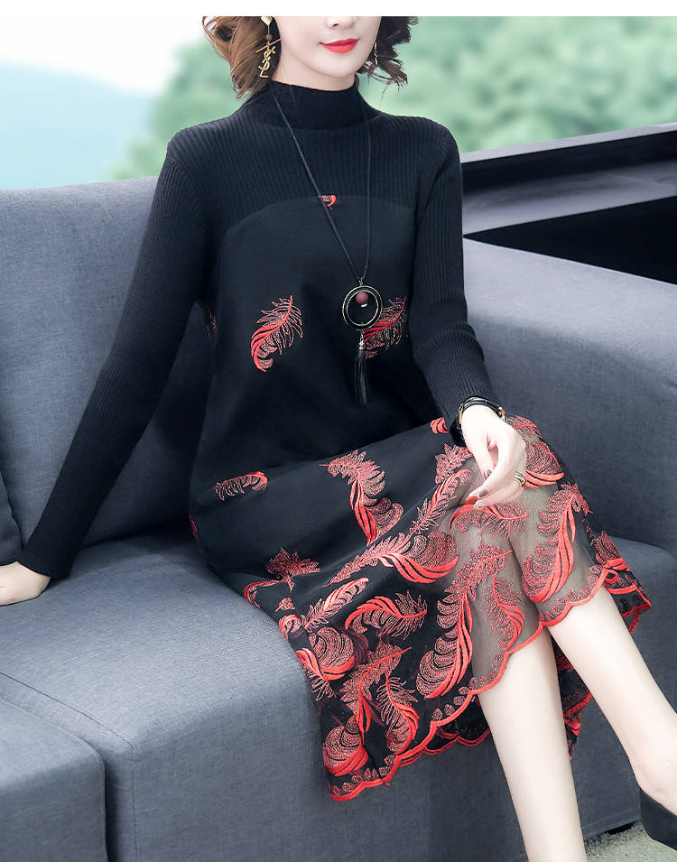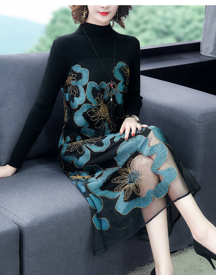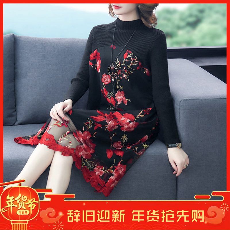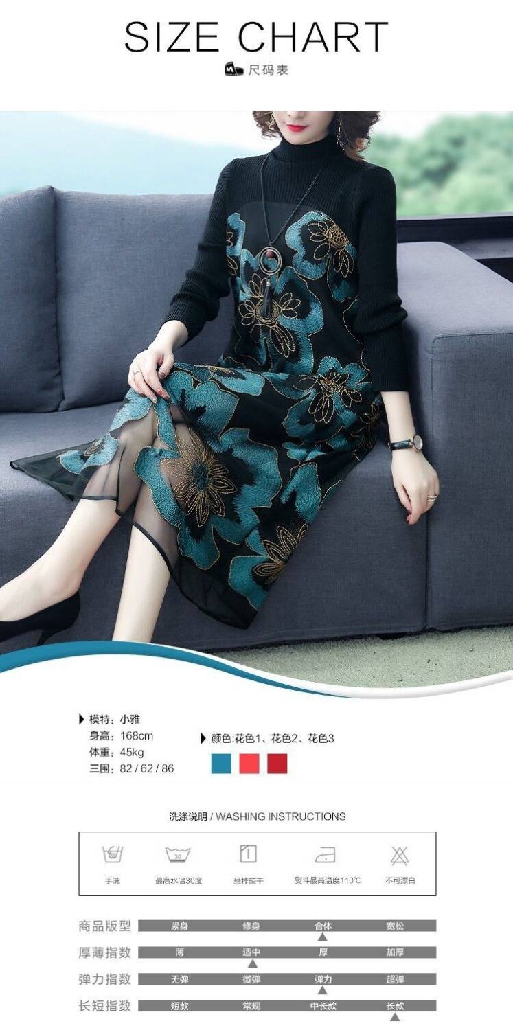 商品名稱:秋冬新款大碼女裝遮肚連衣裙長(zhǎng)袖毛衣拼接網(wǎng)紗繡花連衣裙針織女裝