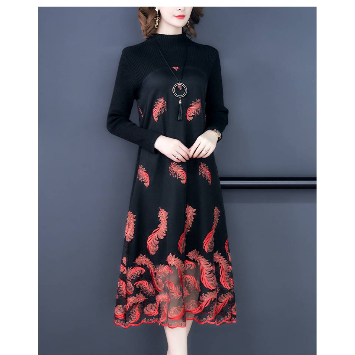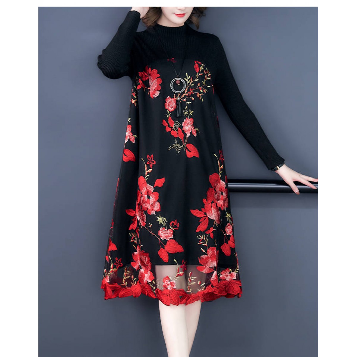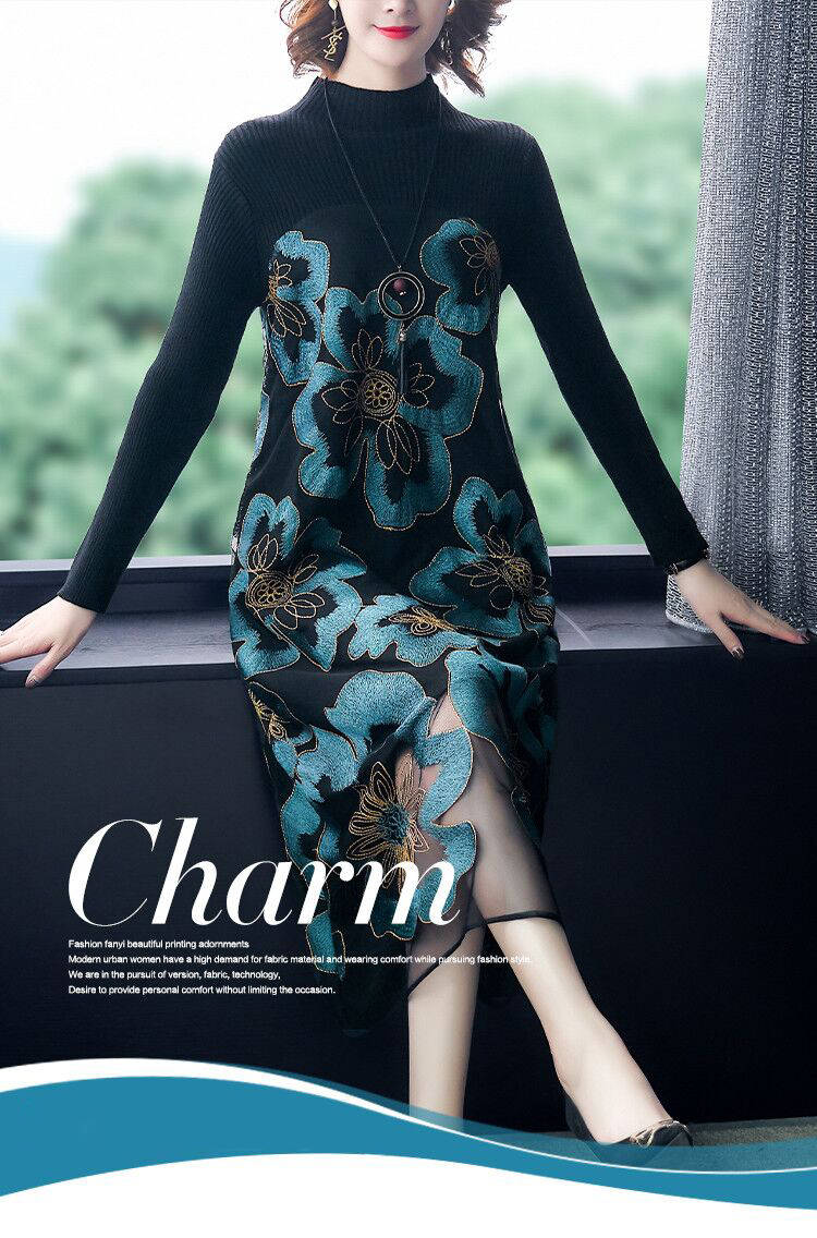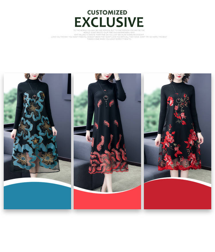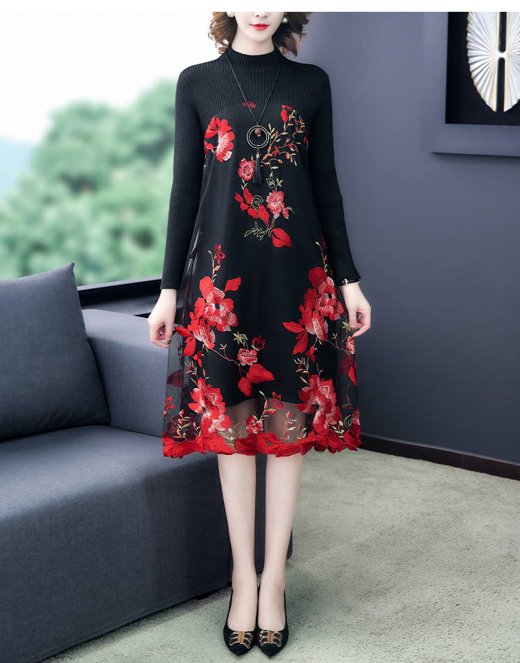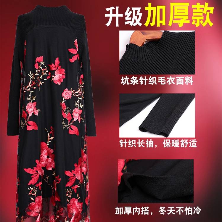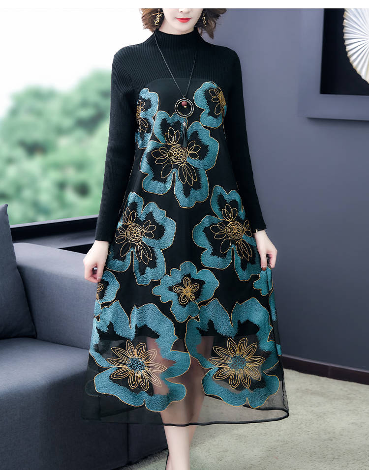 商品名稱:秋冬新款大碼女裝遮肚連衣裙長(zhǎng)袖毛衣拼接網(wǎng)紗繡花連衣裙針織女裝