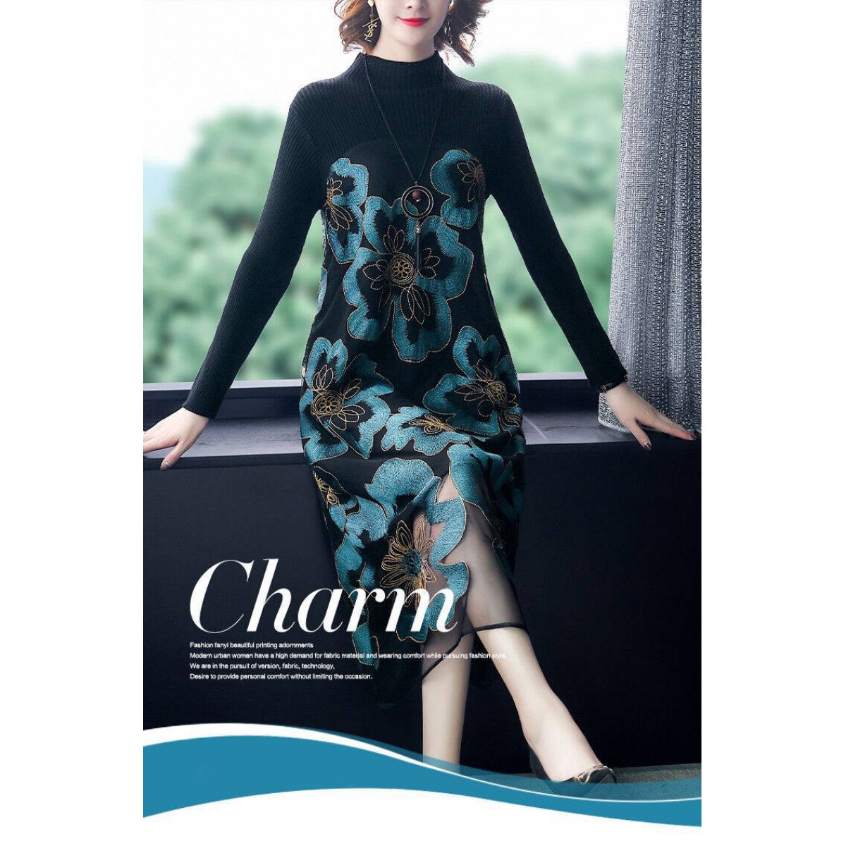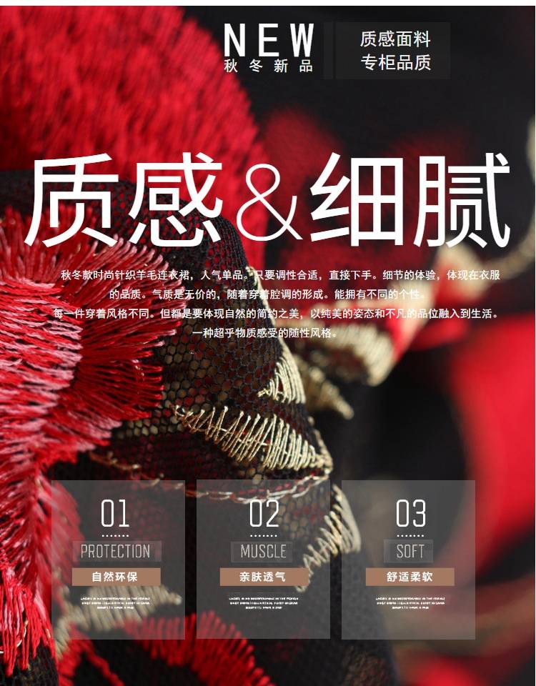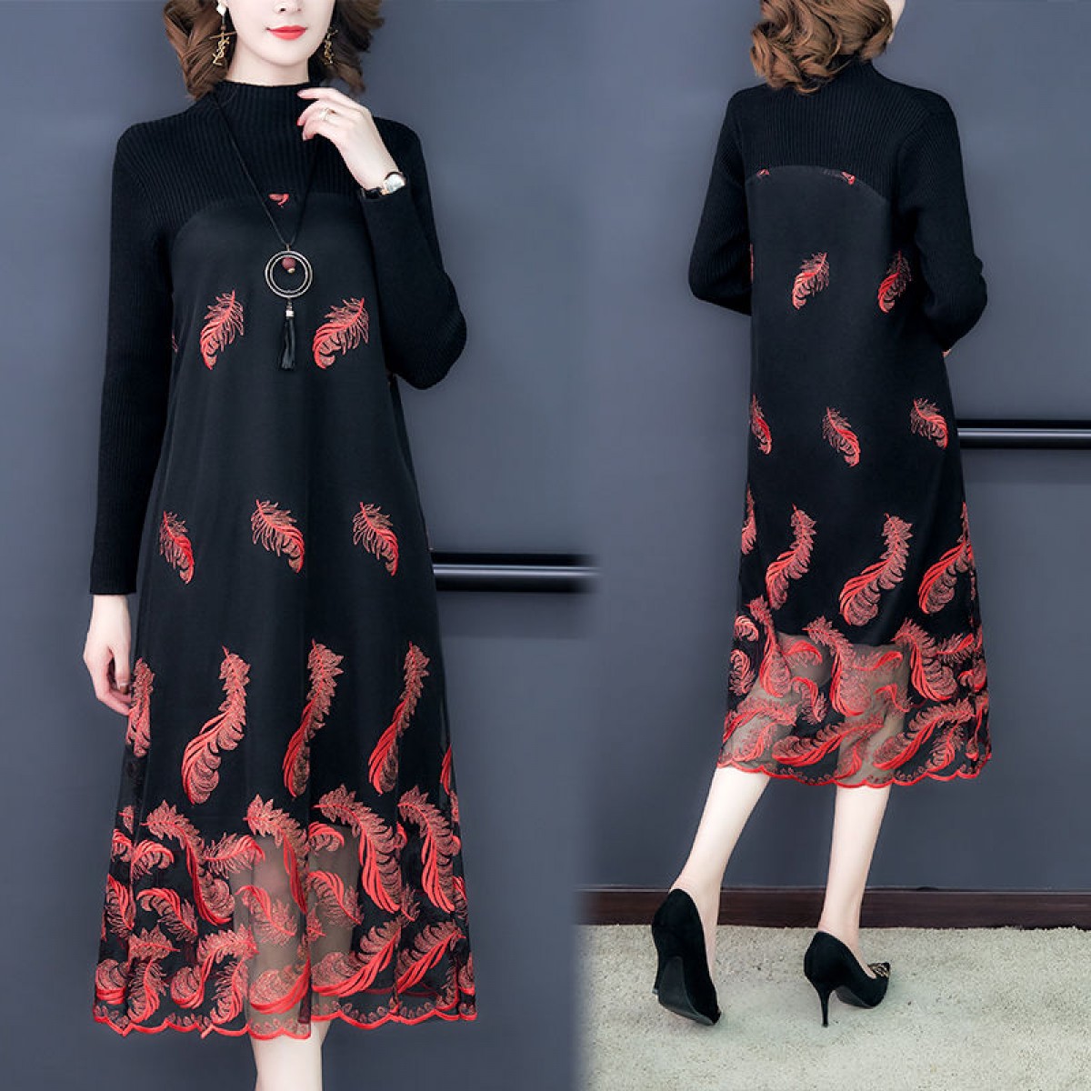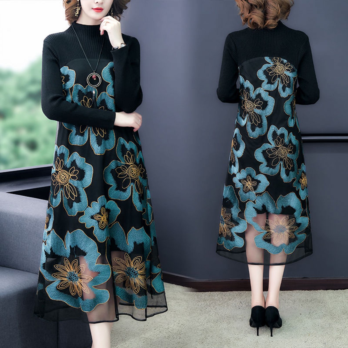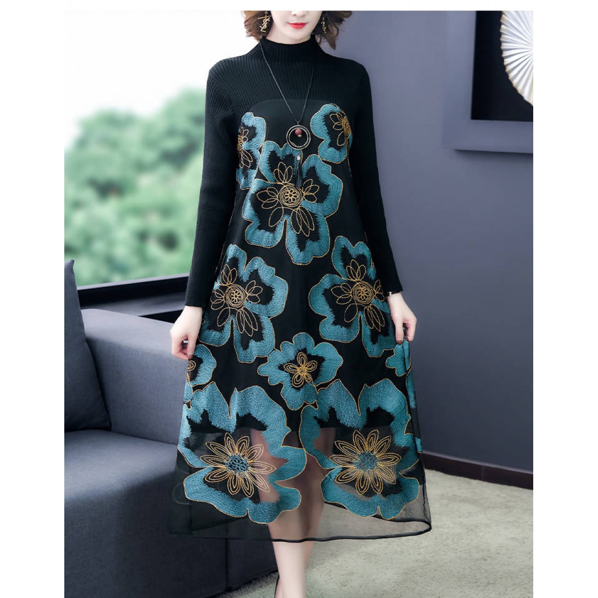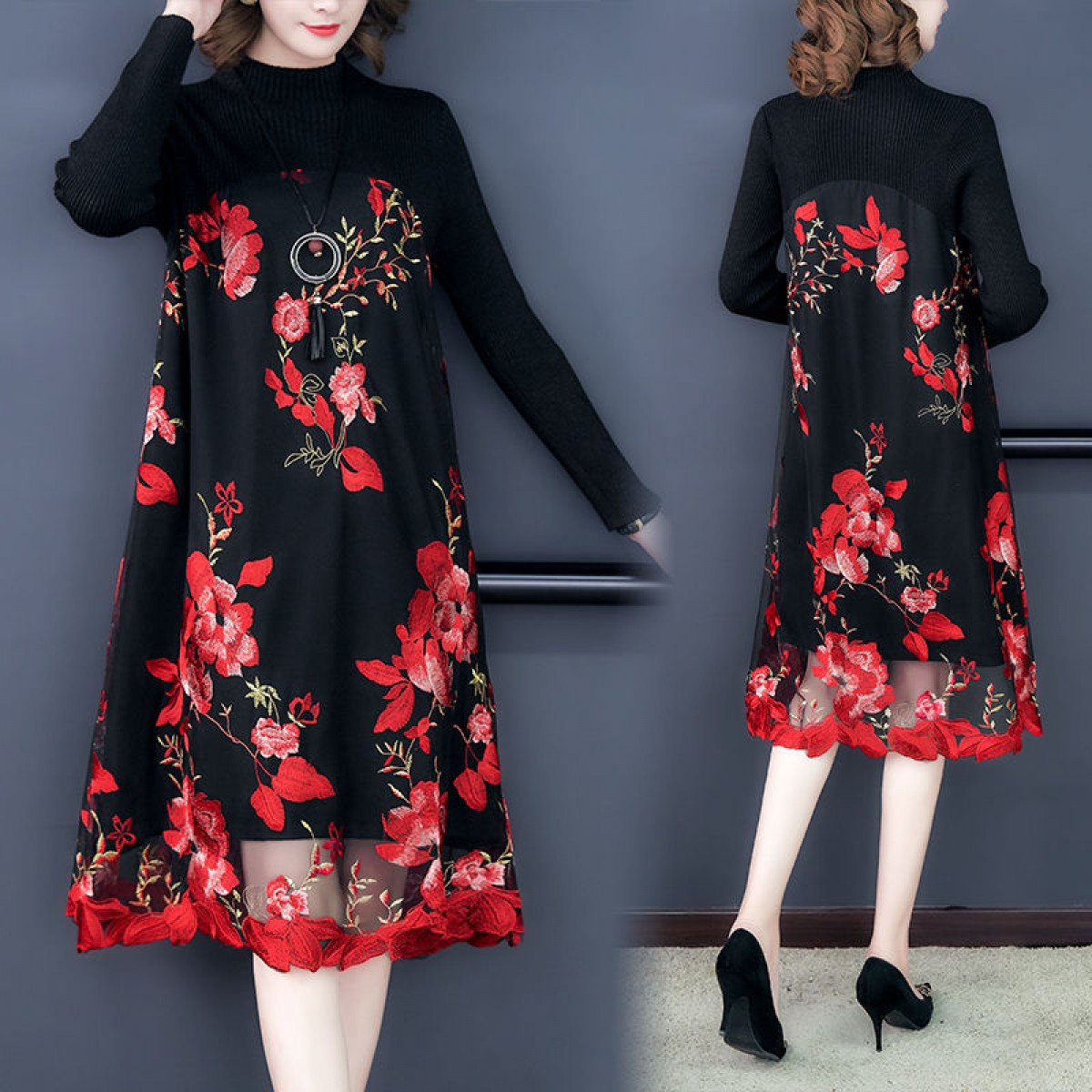 商品名稱:秋冬新款大碼女裝遮肚連衣裙長(zhǎng)袖毛衣拼接網(wǎng)紗繡花連衣裙針織女裝