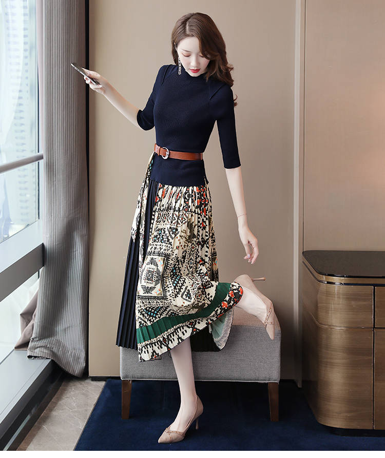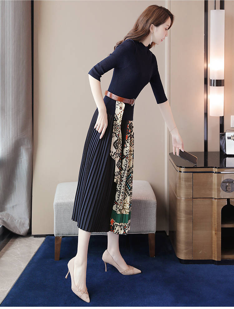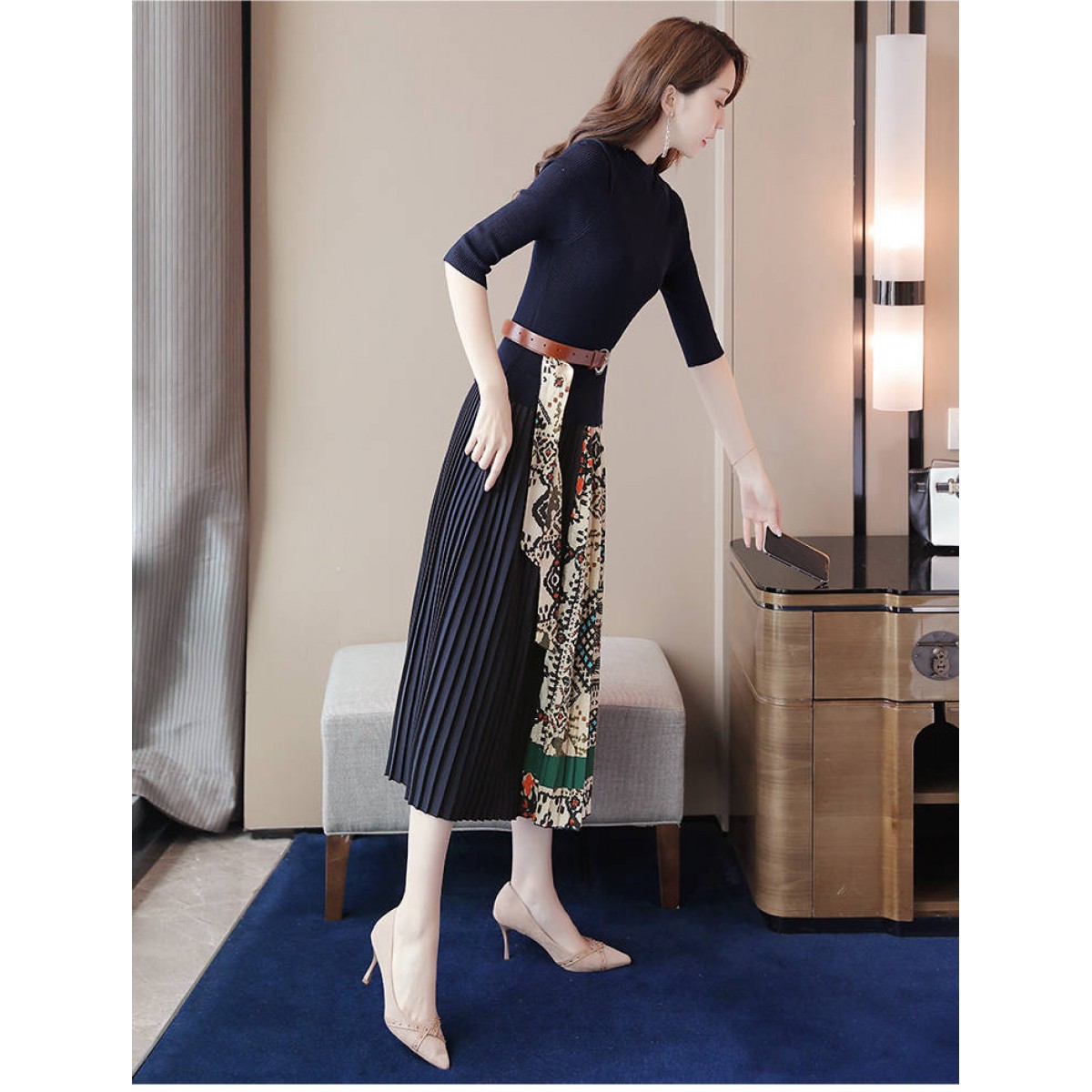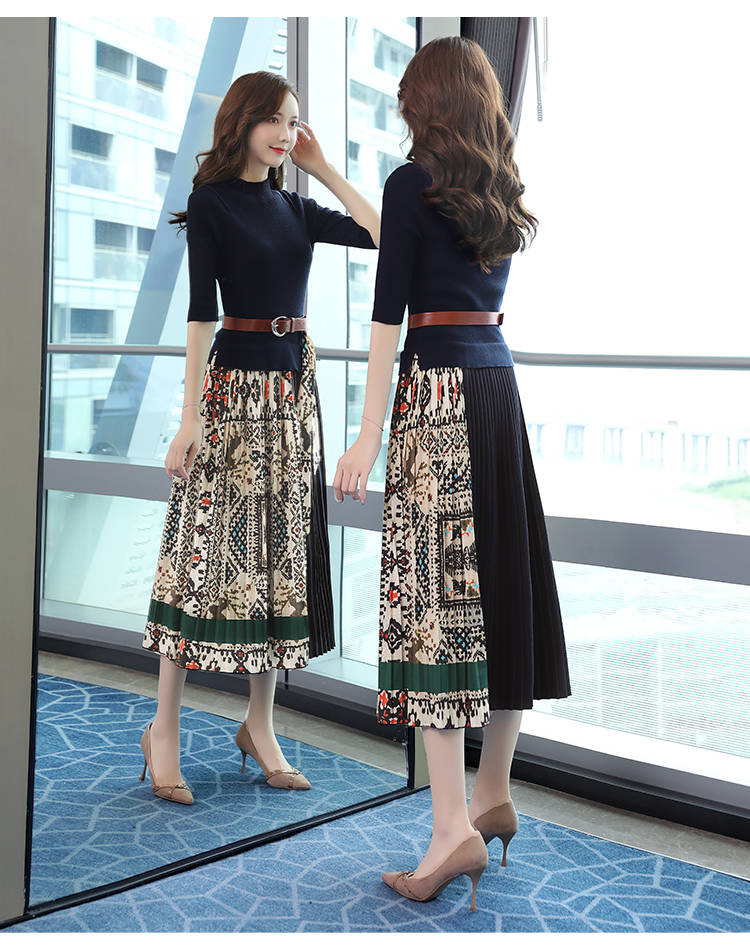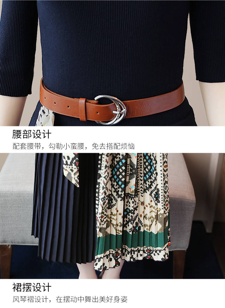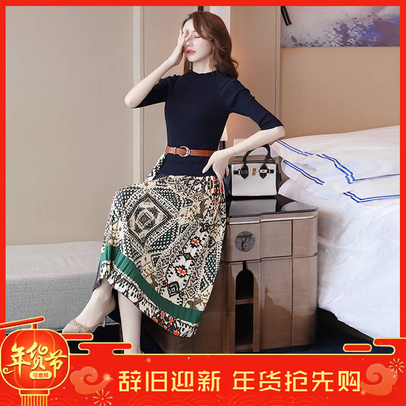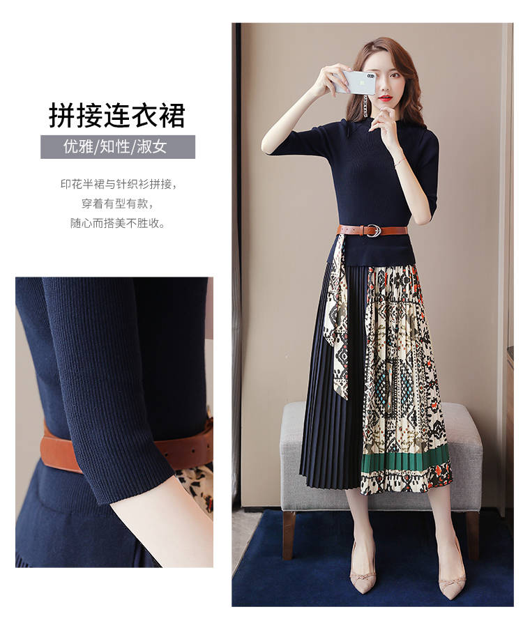 商品名稱:2019秋裝新款女針織衫印花百褶中長款連衣裙Z1584
