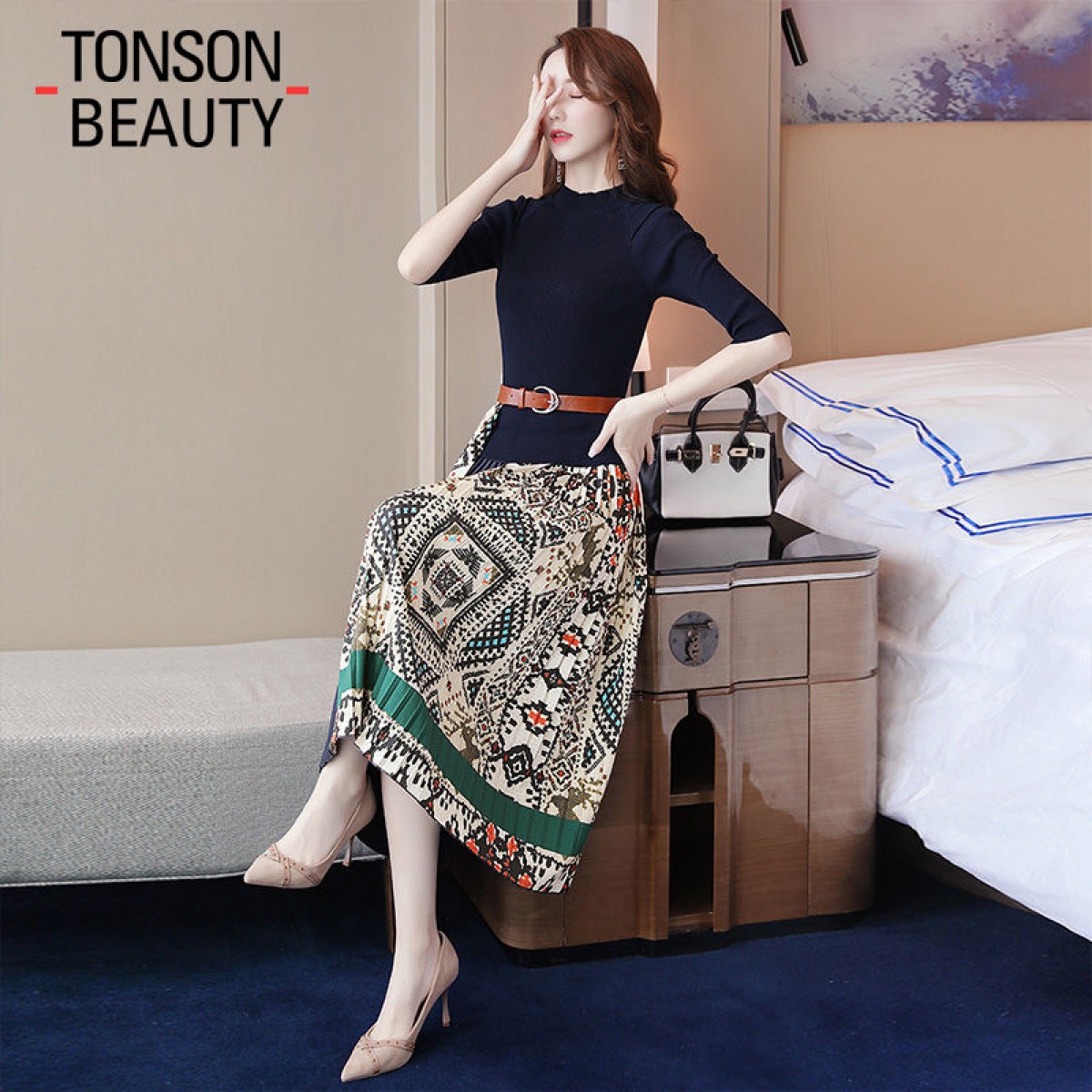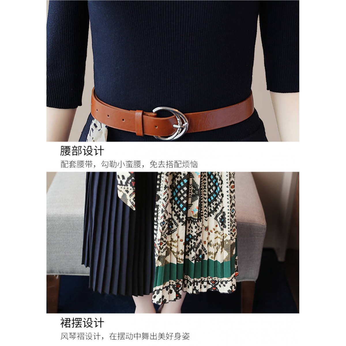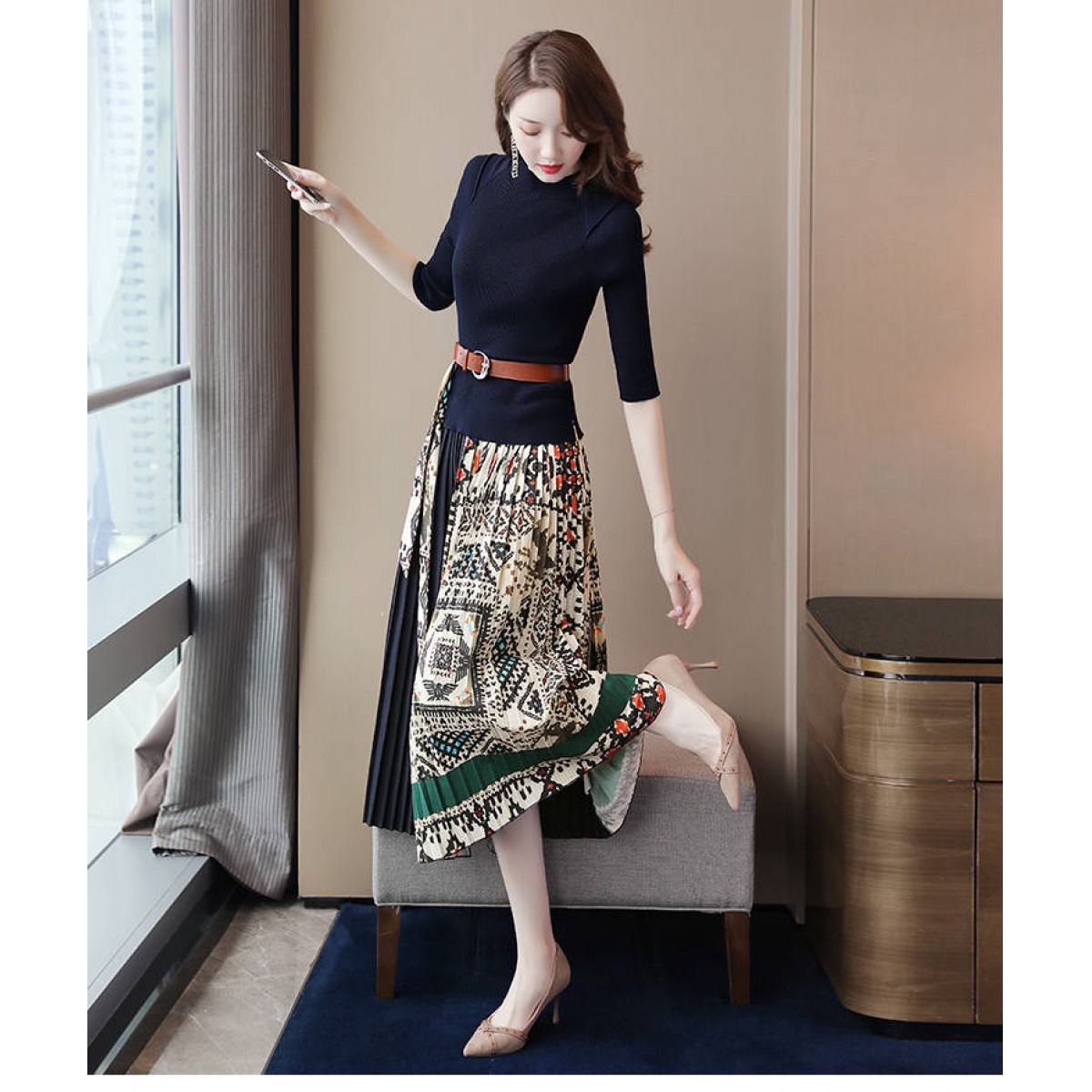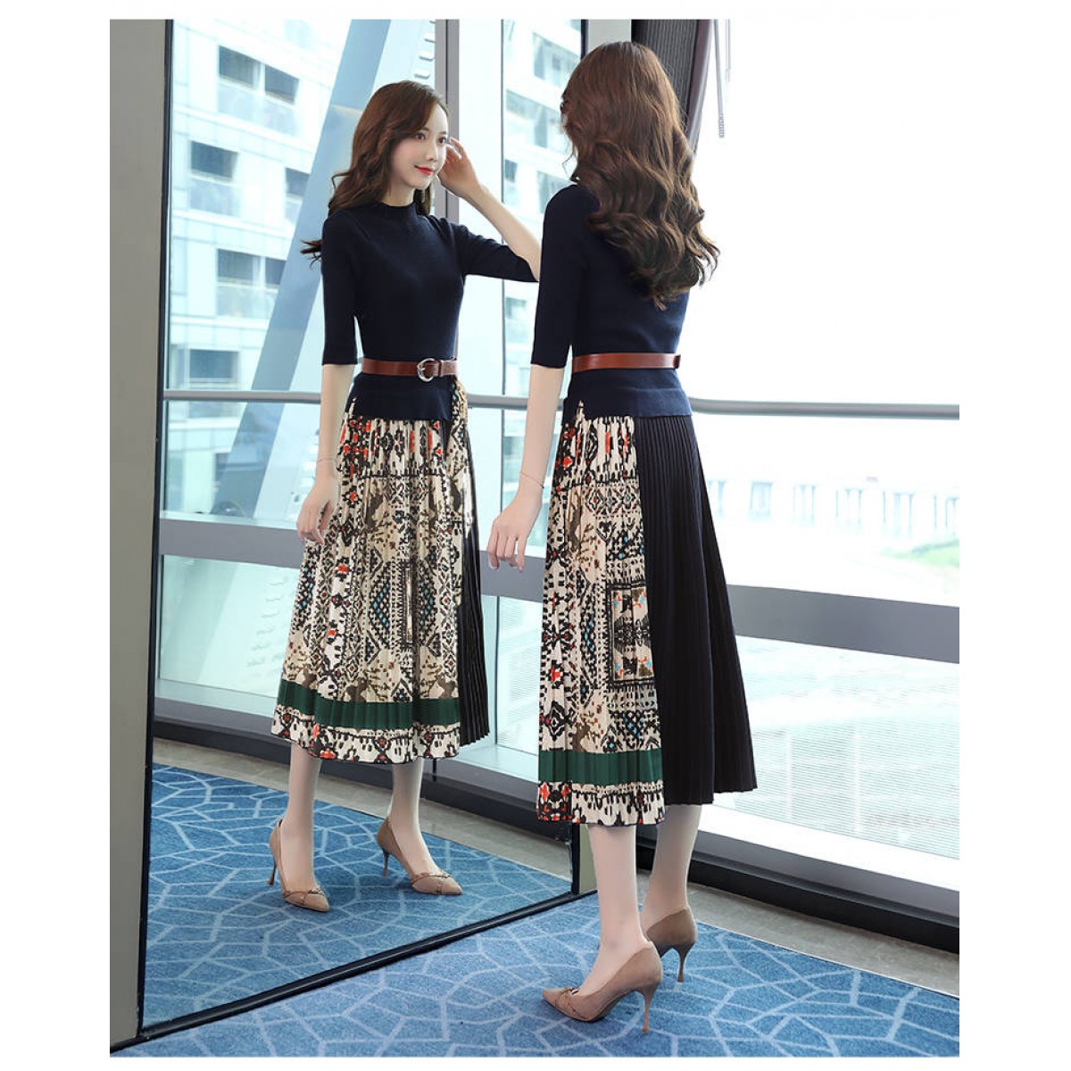 商品名稱:2019秋裝新款女針織衫印花百褶中長款連衣裙Z1584
