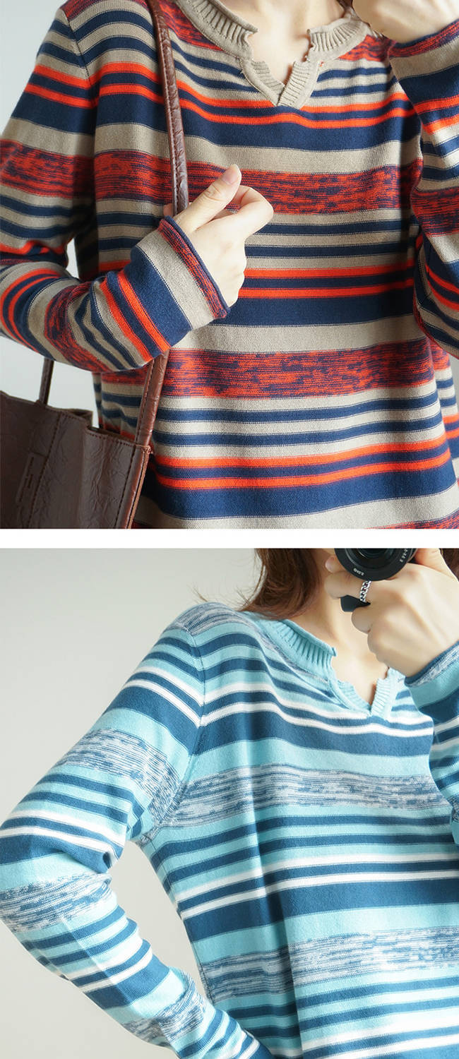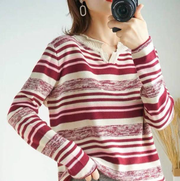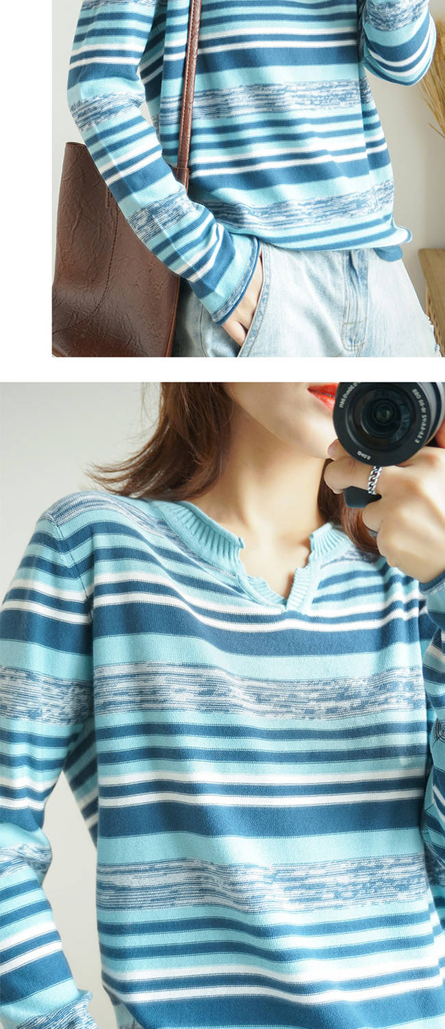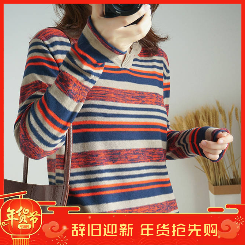 針織長(zhǎng)袖女裝寬松毛衣新款2019春秋v領(lǐng)上衣條紋針織衫薄款打底衫