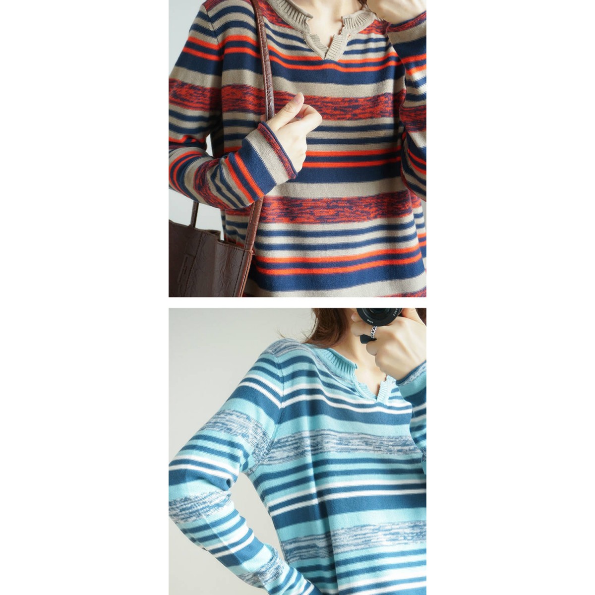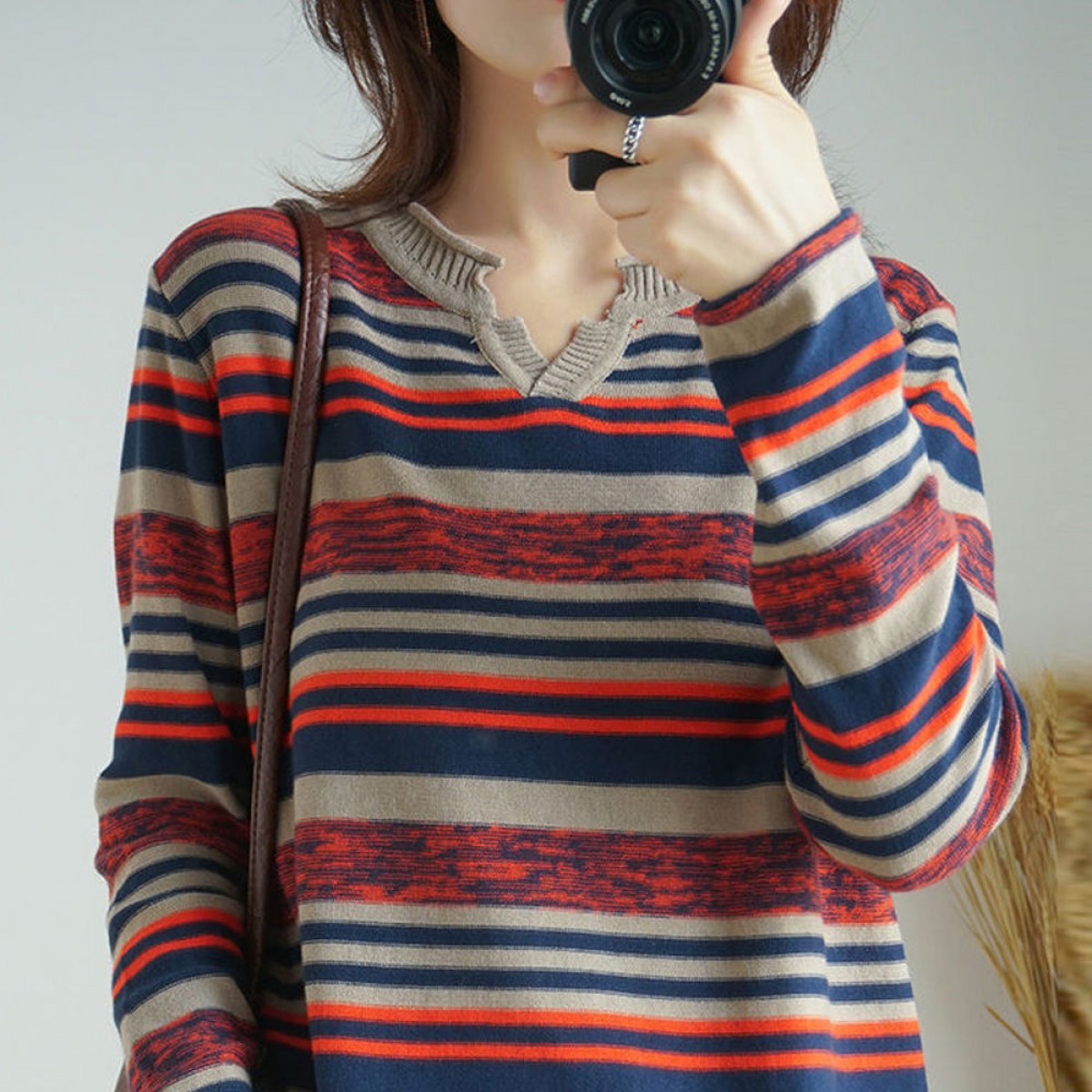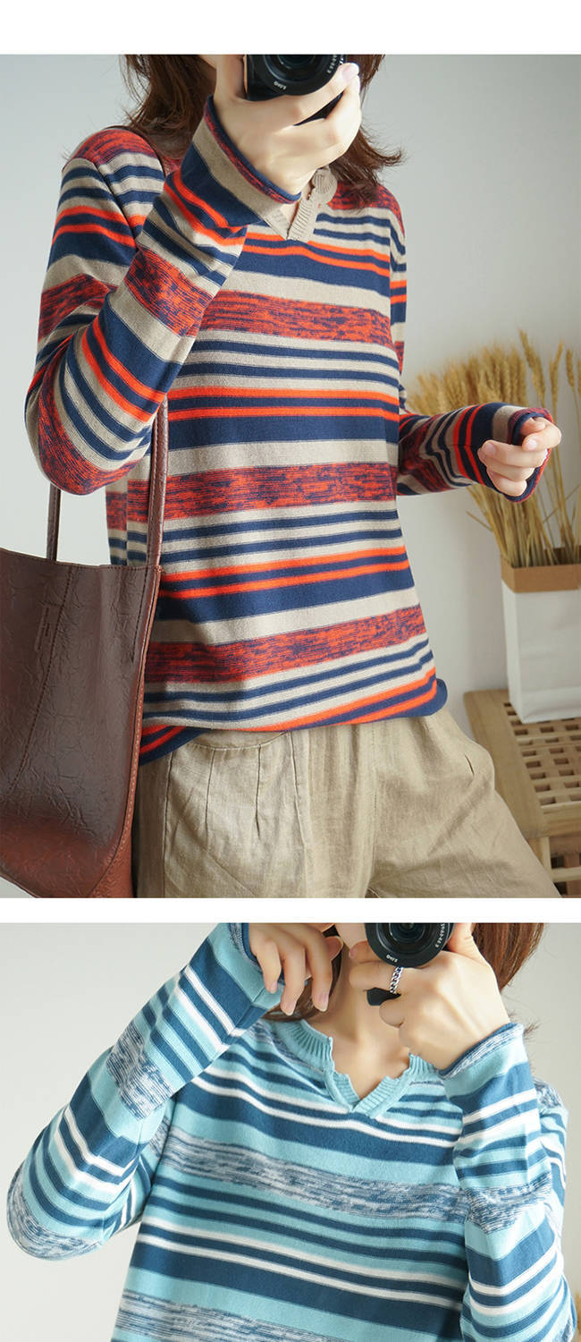 針織長(zhǎng)袖女裝寬松毛衣新款2019春秋v領(lǐng)上衣條紋針織衫薄款打底衫