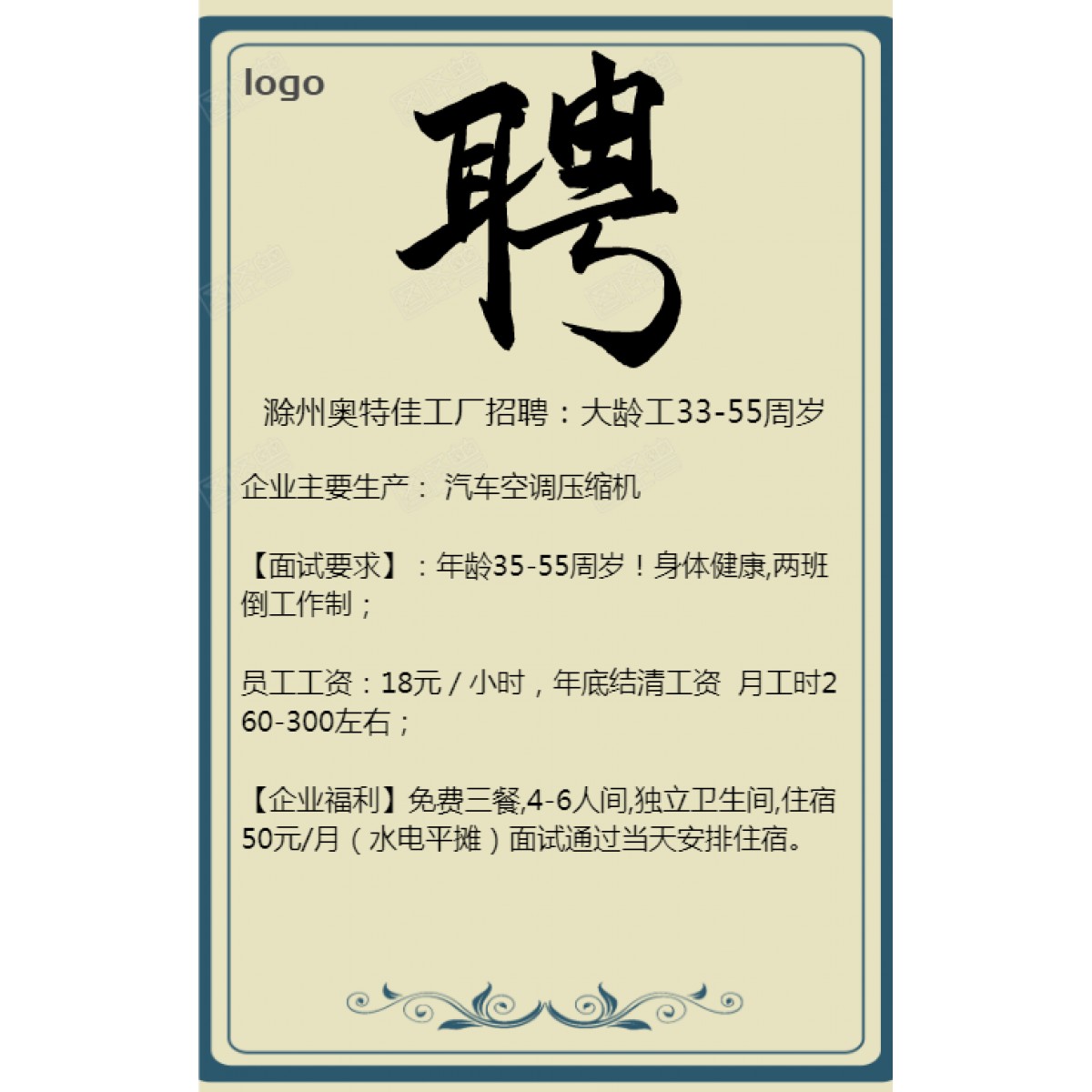 【面試要求】:年齡35-55周歲!身體健康,兩班倒工作制