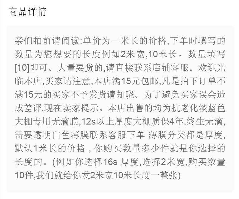 商品名稱:進(jìn)口無滴膜加厚透明塑料薄膜溫室大棚膜蔬菜保溫棚膜養(yǎng)殖黑白膜【2月28日發(fā)完】