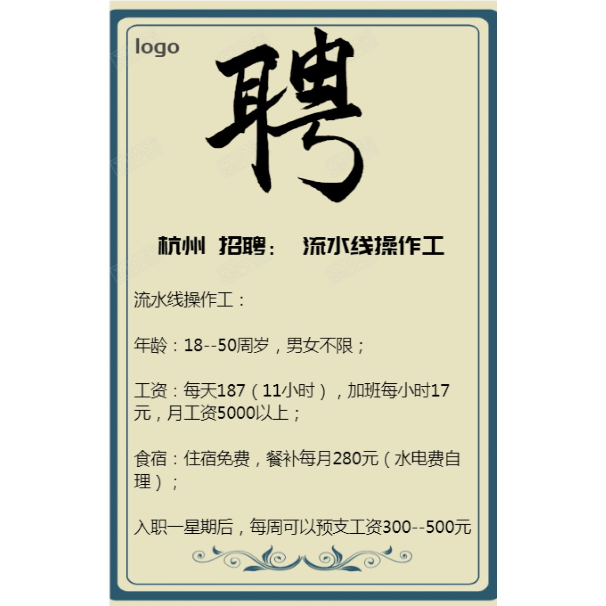 入職一星期后,每周可以預(yù)支工資300--500元