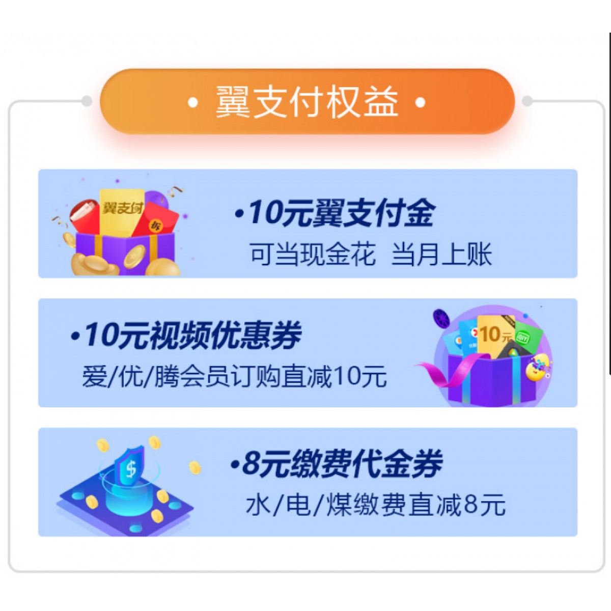 【 翼支付消費權(quán)益】:下載翼支付APP。繳費時 :贈送10元的話費券,8元的電費代金券、10元的視頻優(yōu)惠券。這三項都包括在20元翼支付權(quán)益里面,說白了就是用戶花20塊錢享受到28元的優(yōu)惠券。【 但這20元費用是包括在129元的月租里面,不需要用戶再額外支付?!?/span>