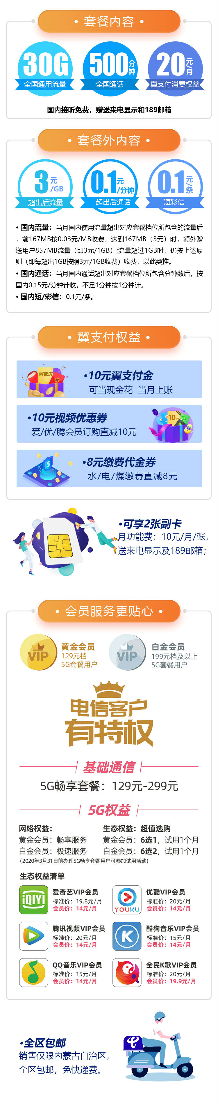 套餐內(nèi)容包括:30G全國通用流量、500分鐘全國通話、20元翼支付消費權(quán)益、國內(nèi)接聽免費、贈送來電顯和189郵箱。