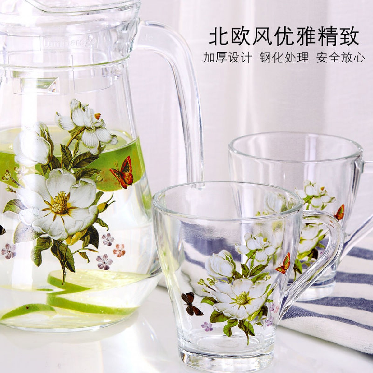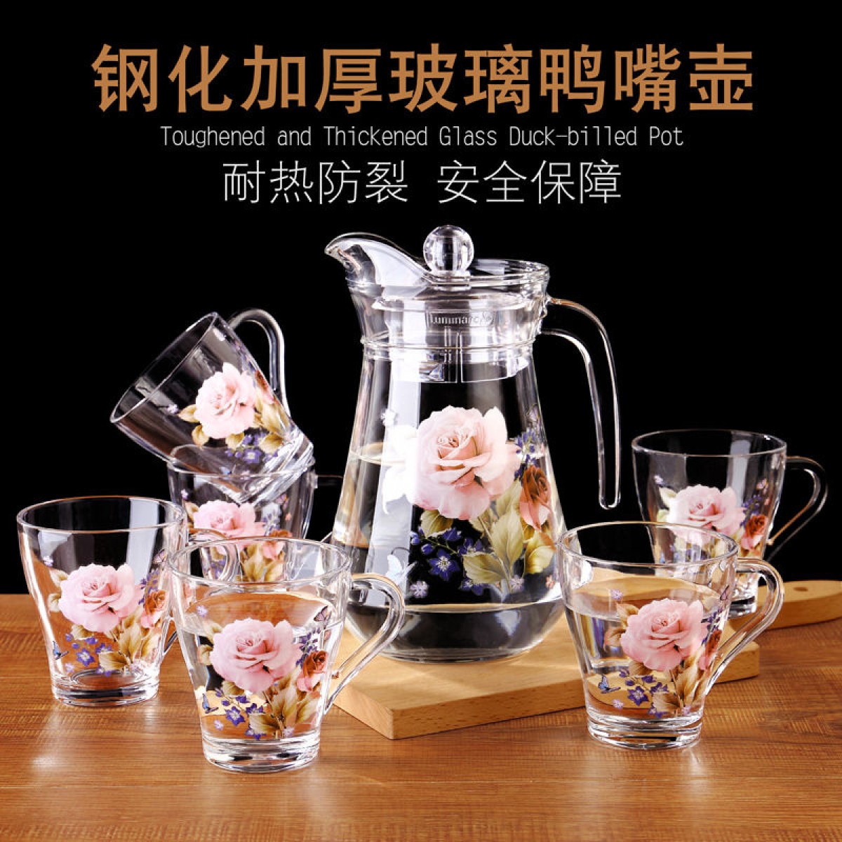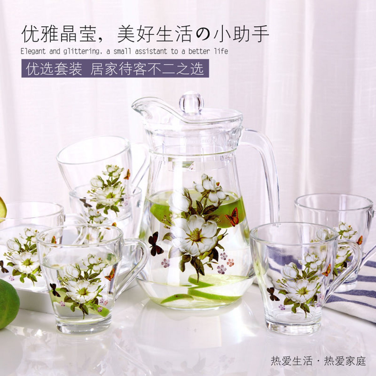 家用印花冷水壺泡茶壺帶把涼水杯加厚耐熱防爆玻璃大容量七件套裝