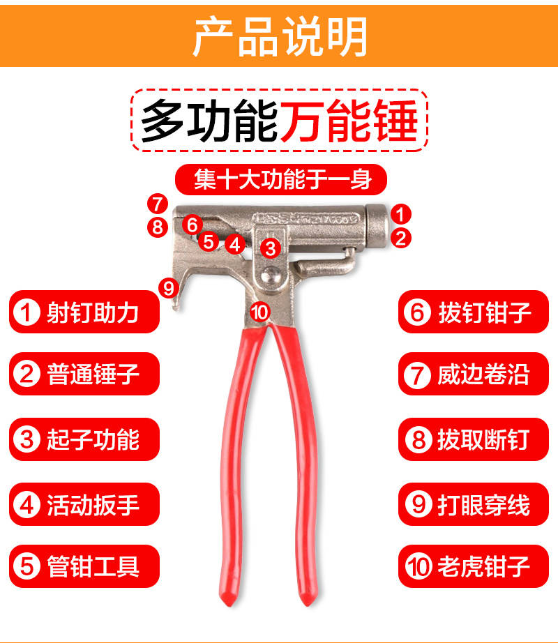 商品名稱:家用多工能10種功能必備扳手 多功能錘子管鉗 鐵敲打手動助力射釘槍
