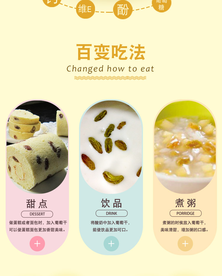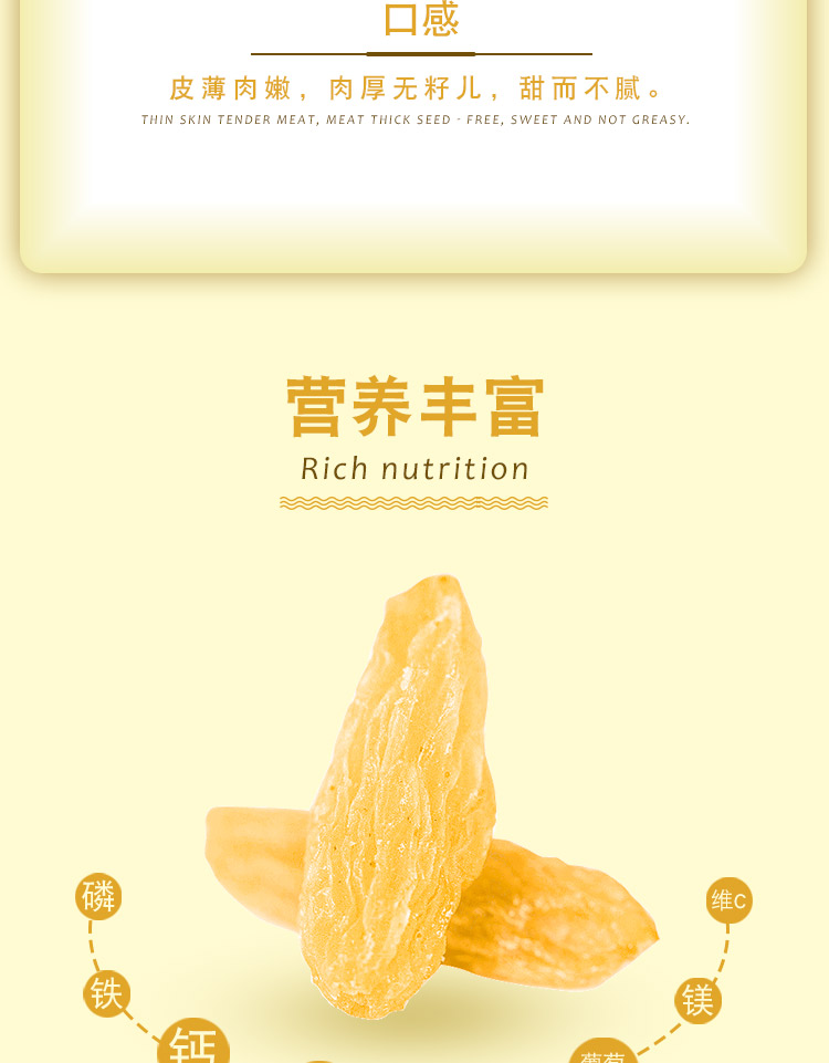 葡萄干 個頭大,肉多 營養(yǎng)價值含量很高 葡萄干含有的鐵和鈣含量十分多,葡萄干含有的鐵量比新鮮葡萄的15倍 有充分的鐵,鈣 防癌 改善手腳冰冷狀況