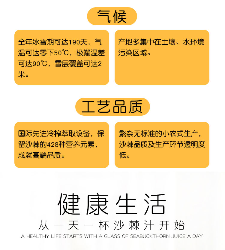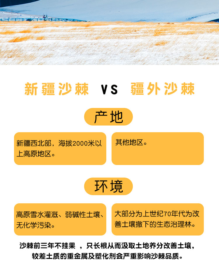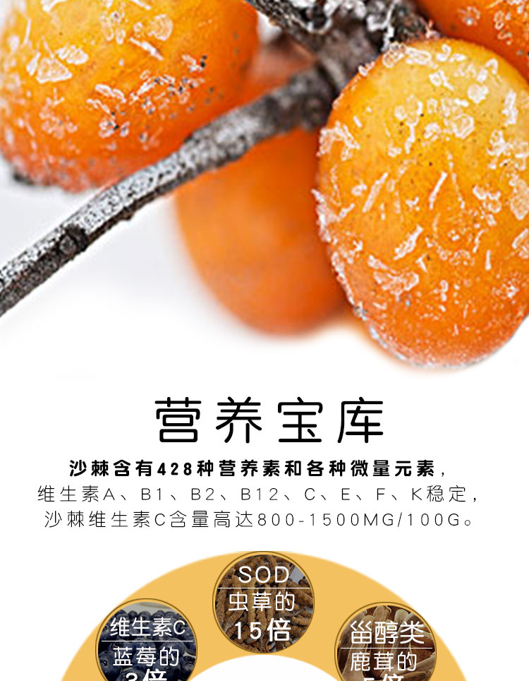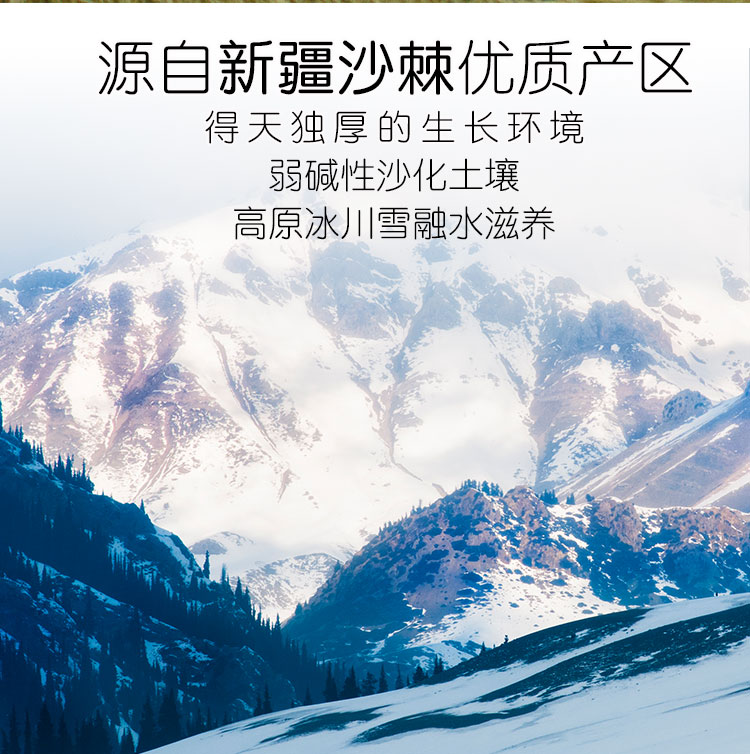 源自新疆沙棘優(yōu)質(zhì)產(chǎn)區(qū),得天獨厚的生長環(huán)境,弱堿性沙化土壤,高原冰川雪融水滋養(yǎng),含有428種營養(yǎng)素和各種微量元素