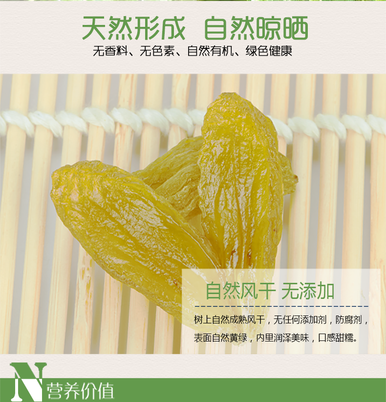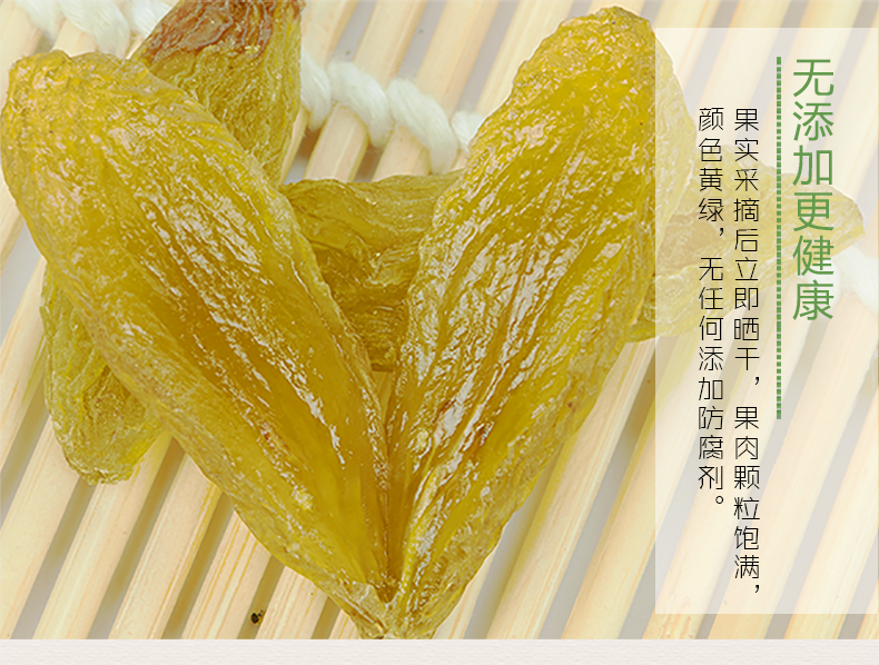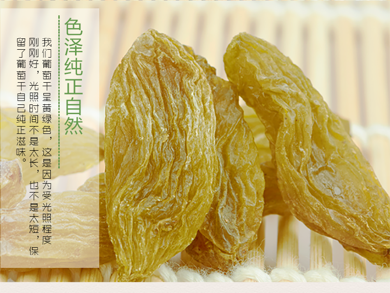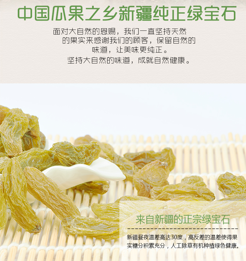 源自新疆吐魯番的葡萄種植基地,特級無核白葡萄干,因其色澤碧綠清新玲瓏剔透,被稱為“綠寶石”,肉厚無籽,酸甜醇香,回味無窮。