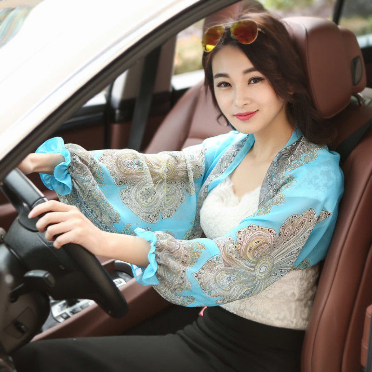 夏季遮陽披肩女印花雪紡防曬長袖套騎行防紫外線披肩絲巾