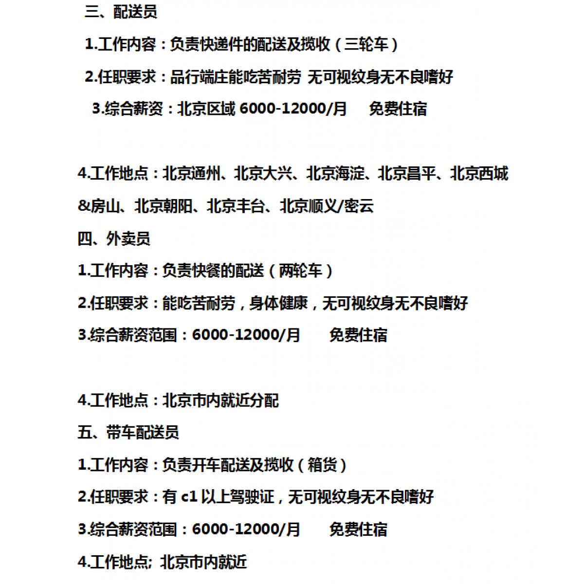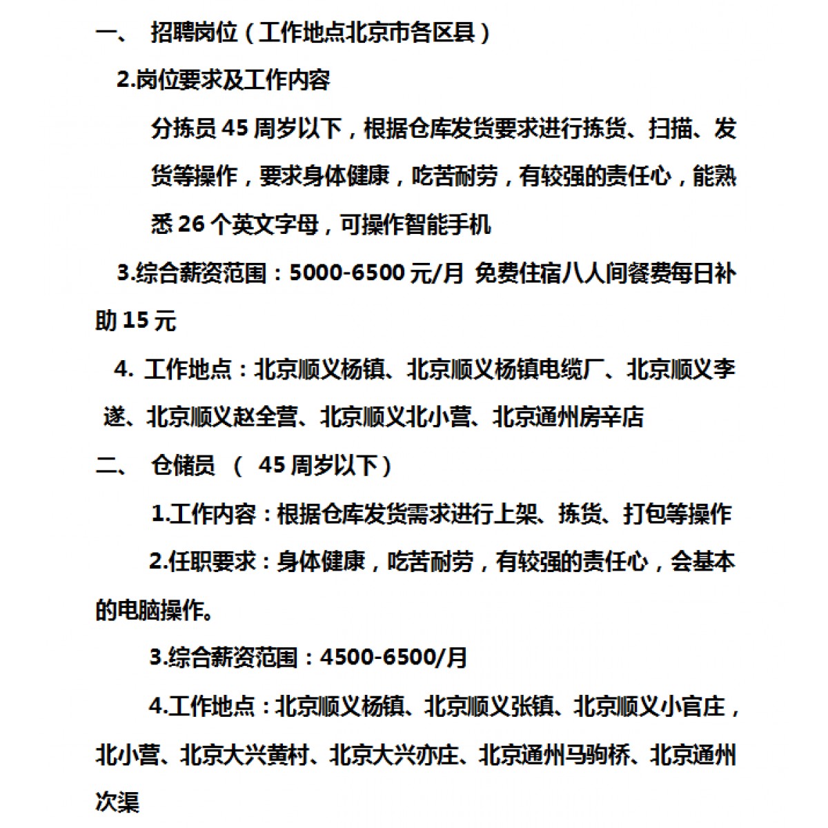 4.工作地點:北京順義楊鎮(zhèn)、北京順義張鎮(zhèn)、北京順義小官莊,北小營、北京大興黃村、北京大興亦莊、北京通州馬駒橋、北京通州次渠