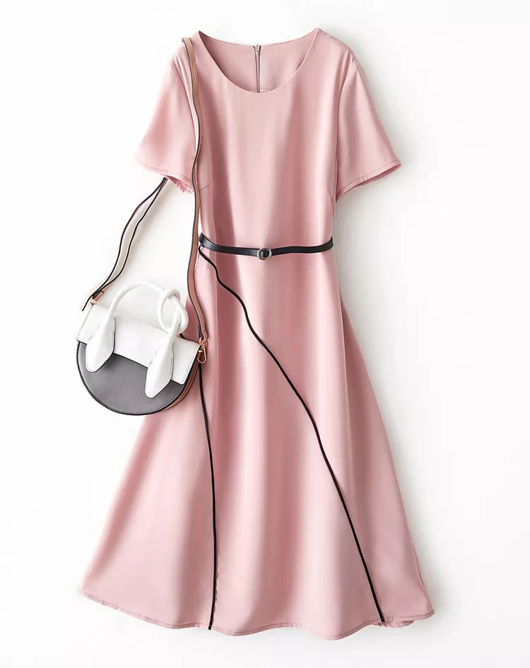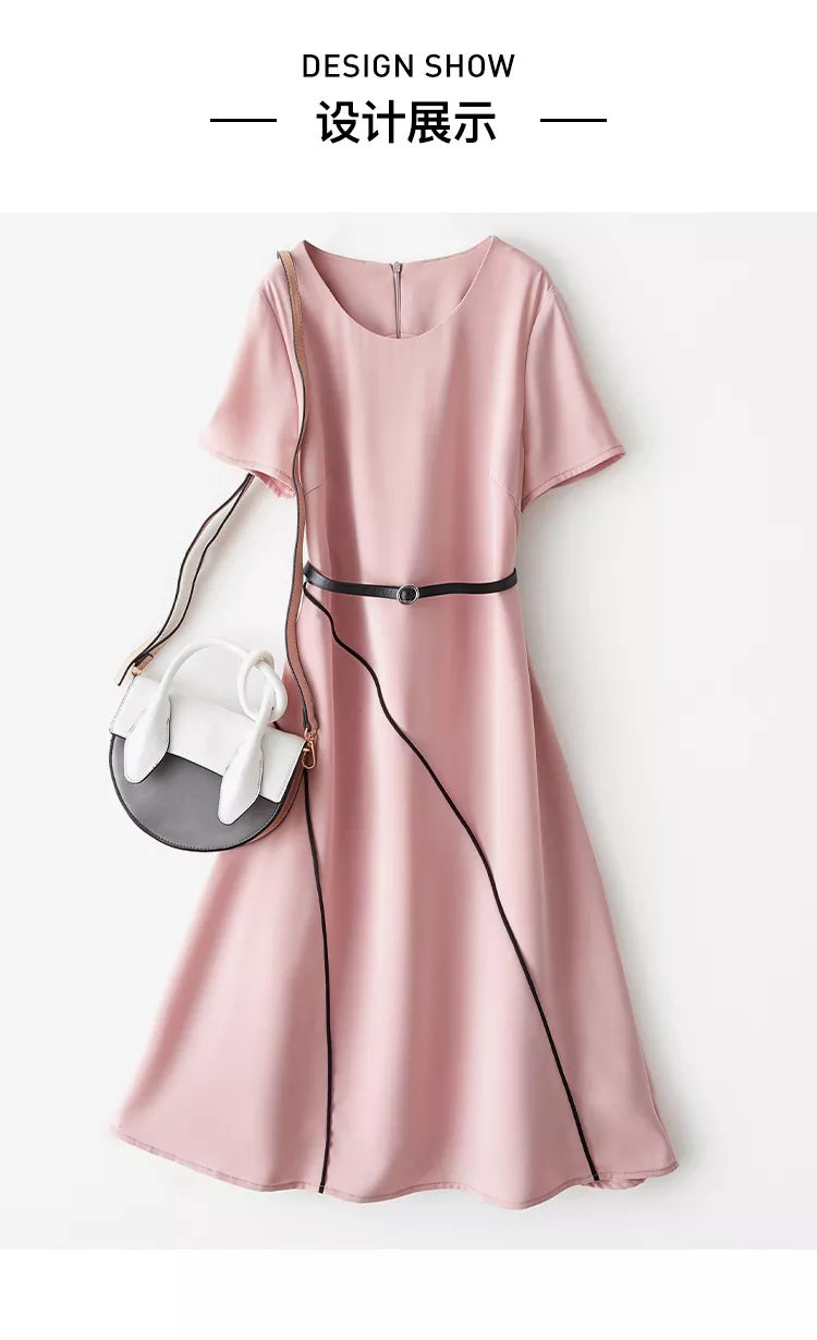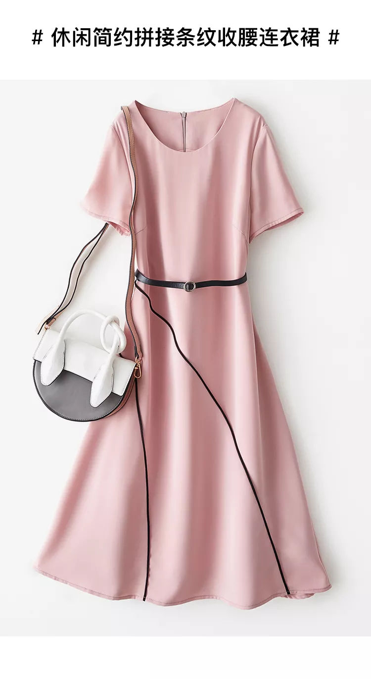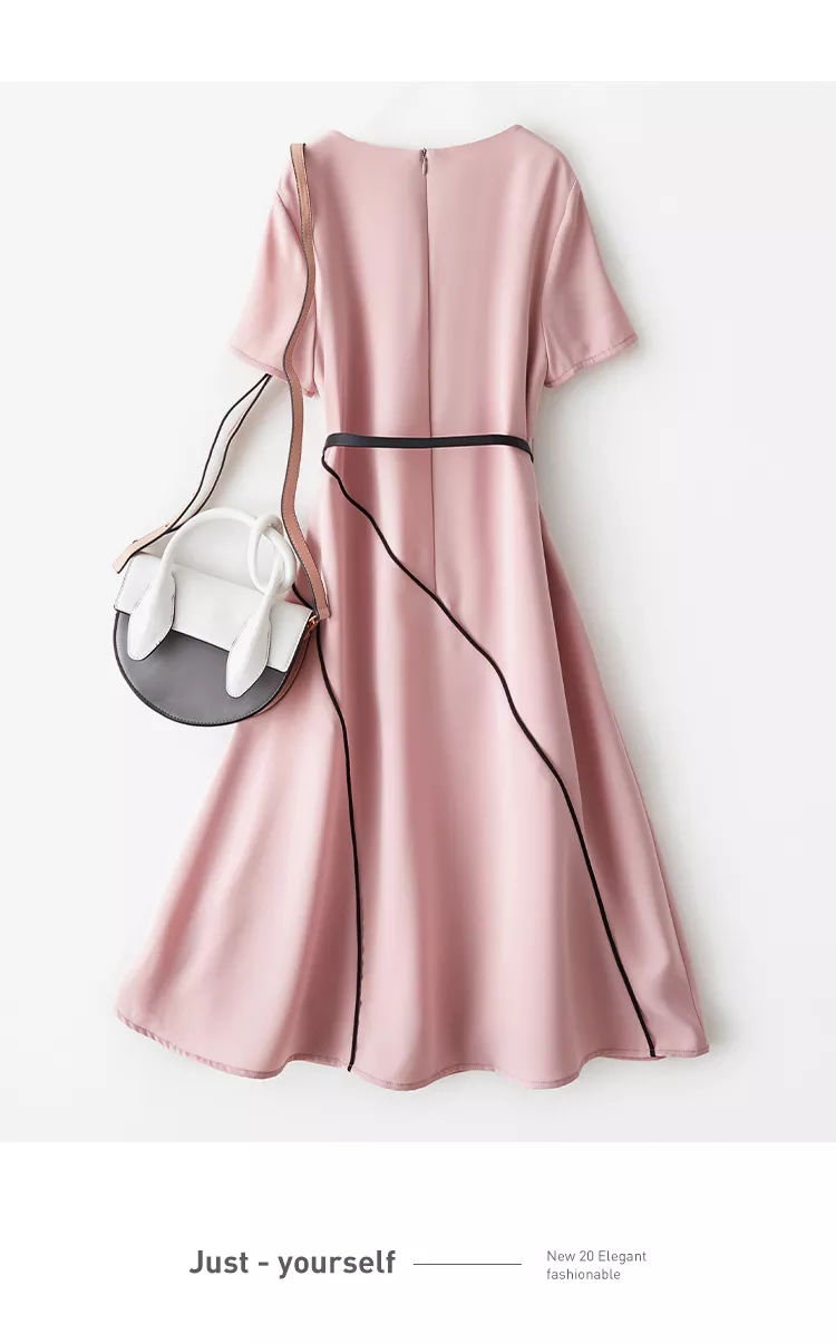 海謐氣質優(yōu)雅連衣裙女2020年夏季新款圓領休閑短袖撞邊收腰A字裙