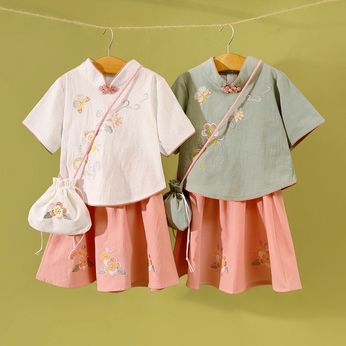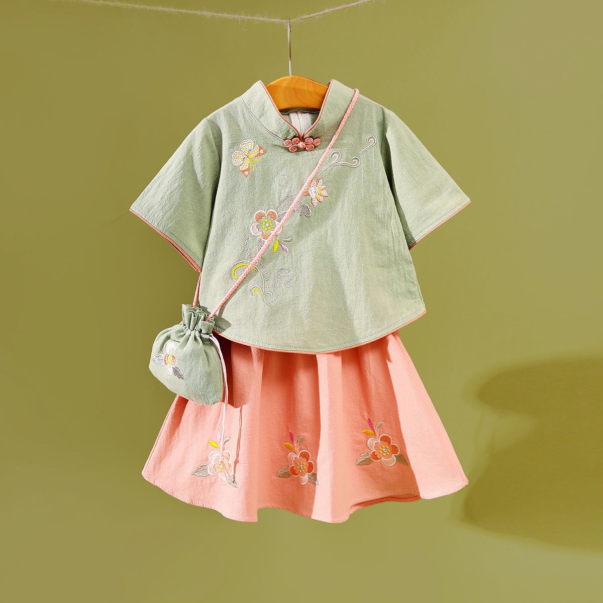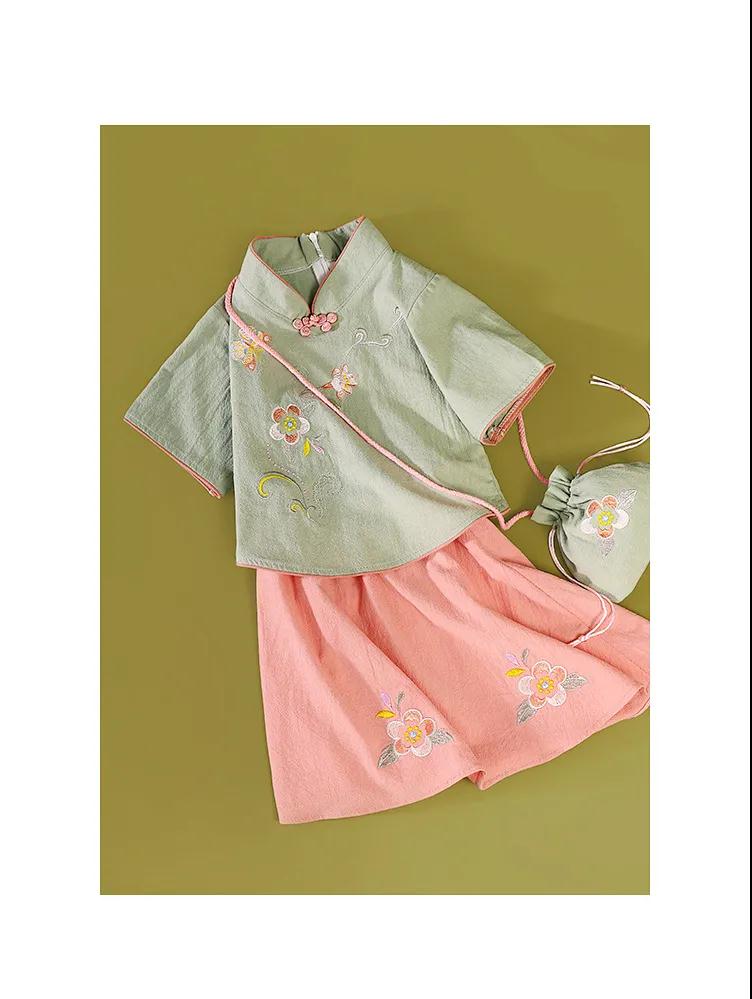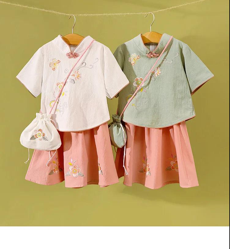 童裝女童中國(guó)風(fēng)春夏新款中童中式復(fù)古旗袍刺繡兒童漢服套裝