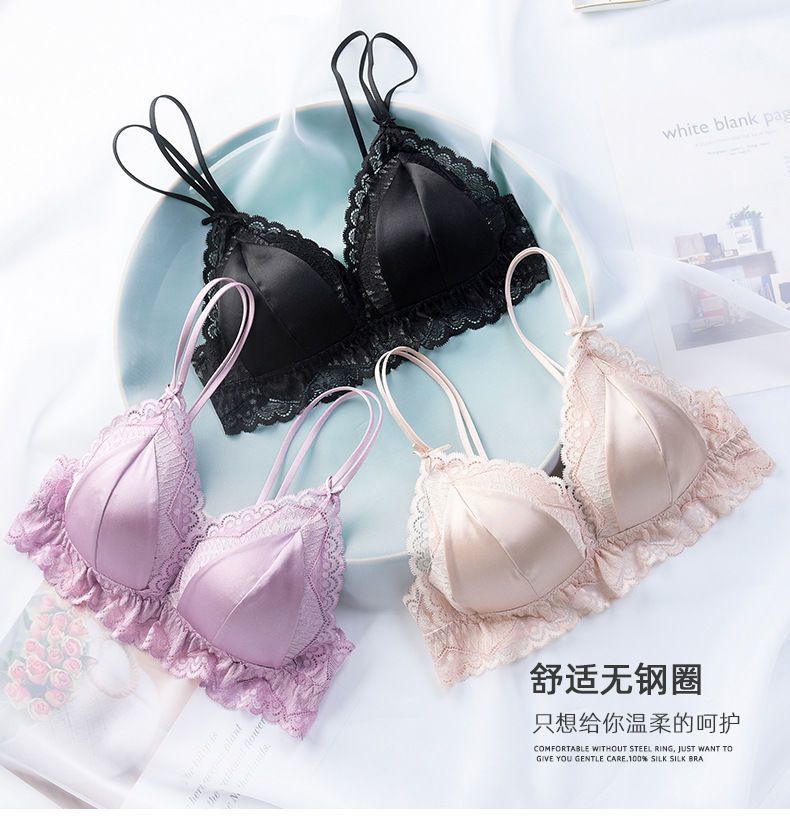 婷美無鋼圈天蠶真絲文胸法式性感三角杯內(nèi)衣蕾絲細帶薄款女士內(nèi)衣