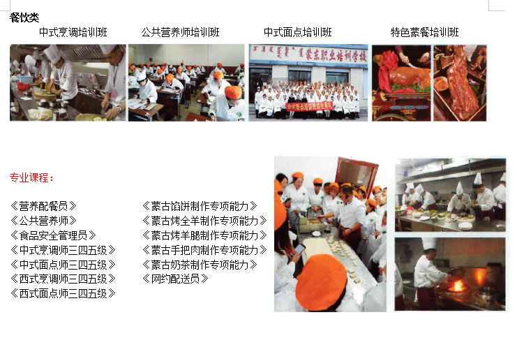 C類56課時(shí)(7天)包括培訓(xùn)工種:蒙古餡餅、蒙古烤全羊、蒙古烤羊腿、蒙古手把肉、蒙古奶茶、母嬰護(hù)理(月嫂)。