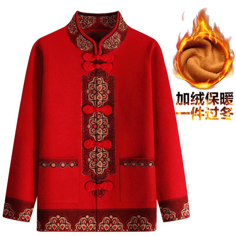 中老年加絨毛衣唐裝女媽媽裝上衣針織開衫秋冬裝保暖外套奶奶裝